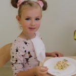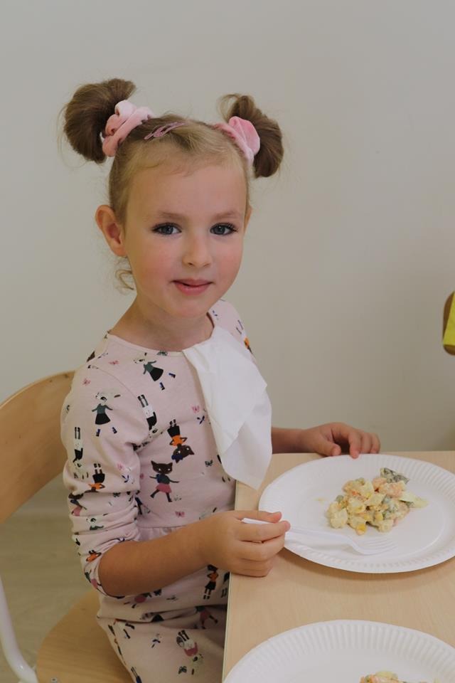 sałatkę, przestrzegając przy tym zasad bezpieczeństwa przy posługiwaniu się nożem oraz zasad higieny przygotowania posiłków. Przygotowywanie sałatki dało dzieciom wiele satysfakcji. Na koniec gotową sałatkę nałożyliśmy na talerze urządzając w sali prawdziwą ucztę