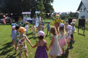 Urodziny jak w wesołym miasteczku! Był kolorowy klaun , dużo śmiechu, wspólne zabawy i tańce.Na placu czekały dmuchańce , a