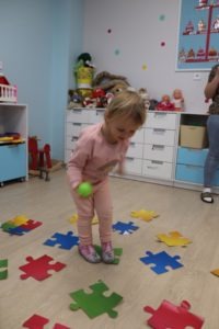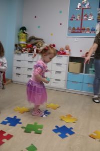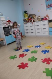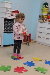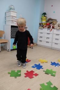utrwalały kolory skacząc po dużych kolorowych puzzlach