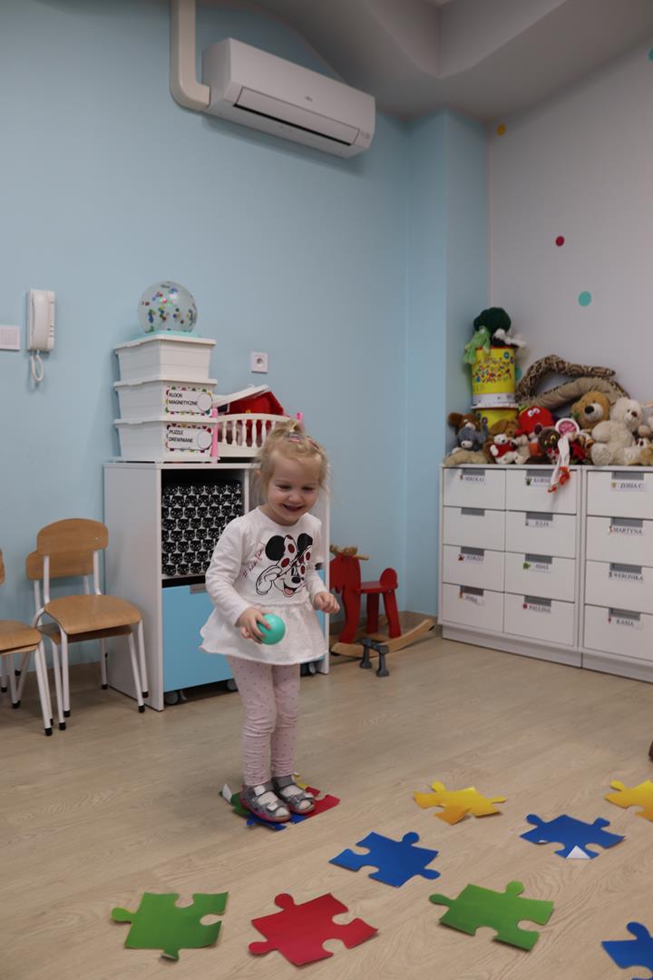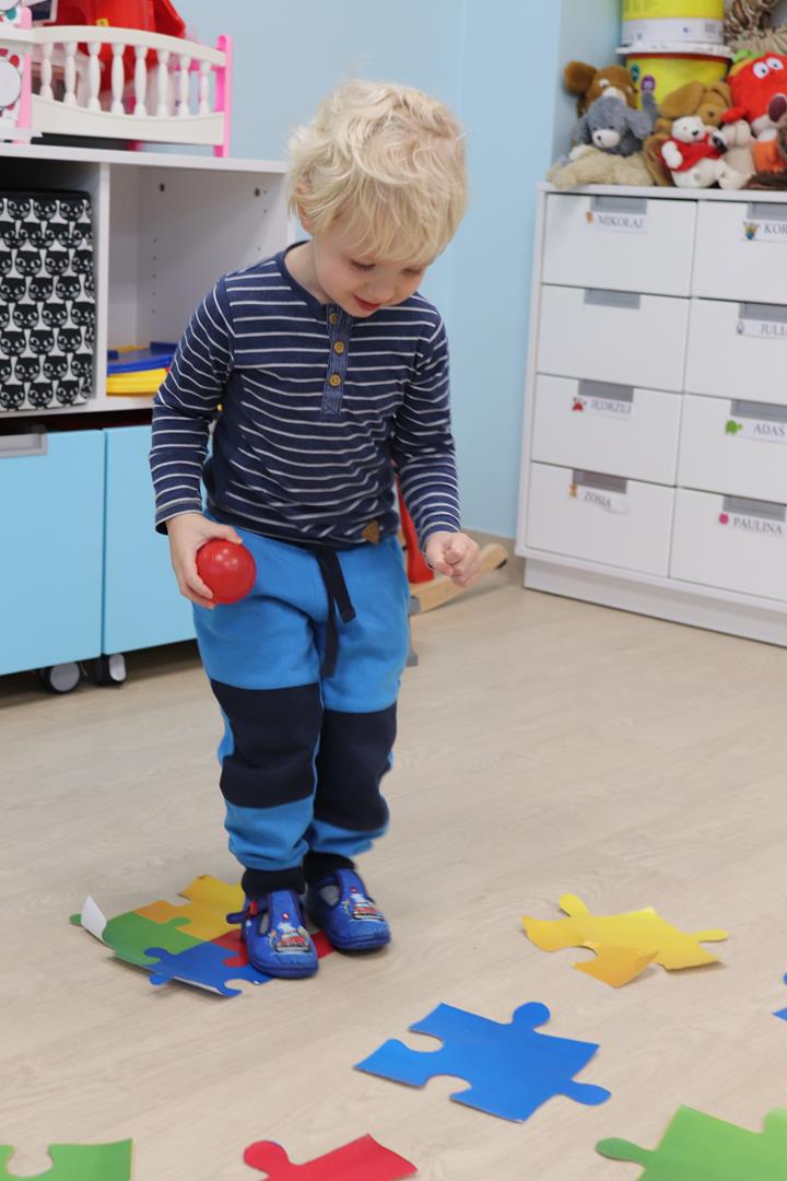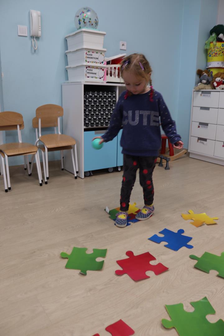 utrwalały kolory skacząc po dużych kolorowych puzzlach