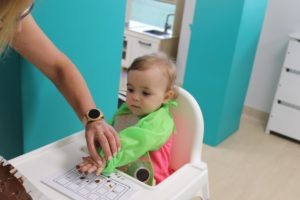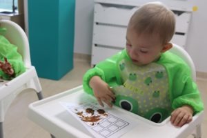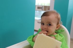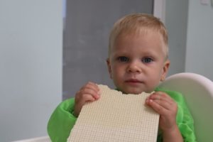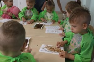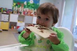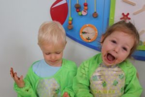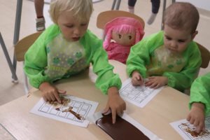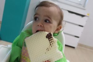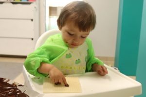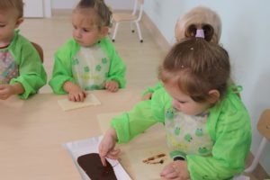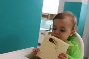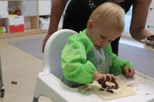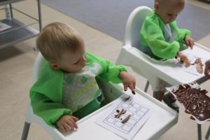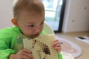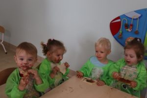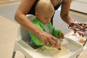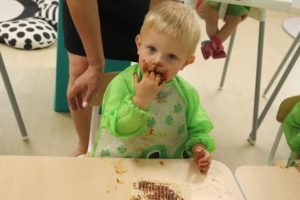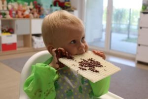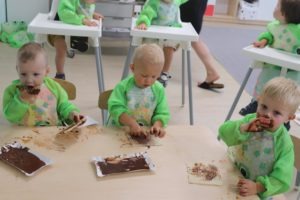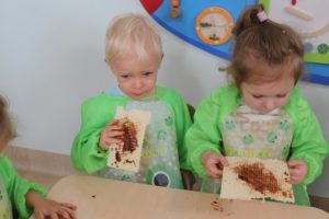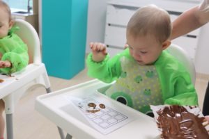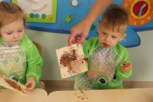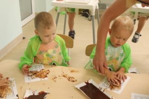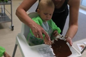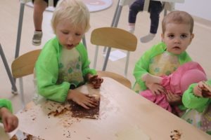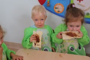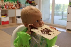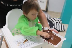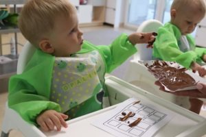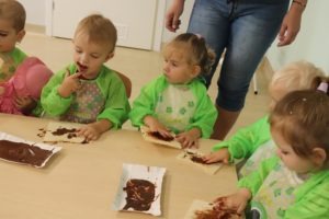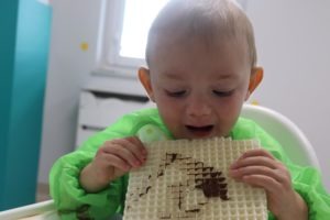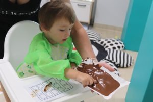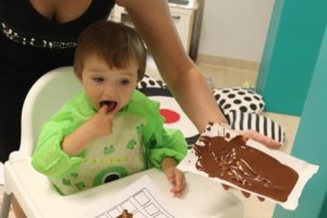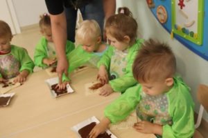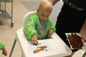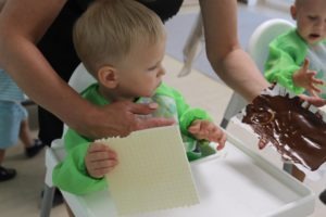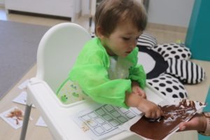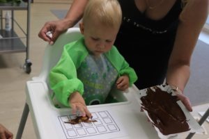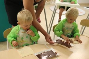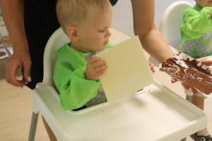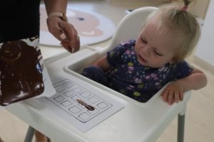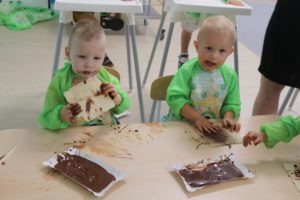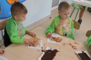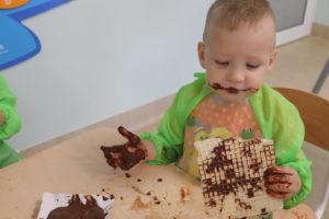 Każdy maluszek wykonał czekoladowy rysunek na kartce i na waflu według własnej fantazji i przy użyciu tylko dłoni. Nic w tym dziwnego, że palce trafiały raz na wafel a raz do buzi… 😋