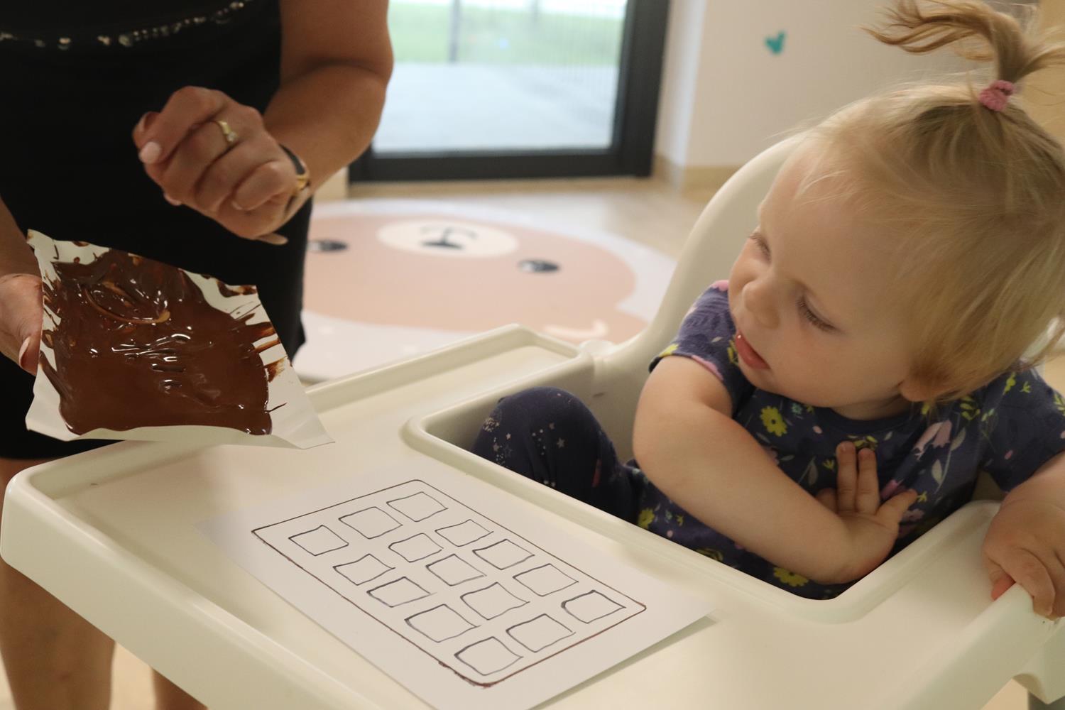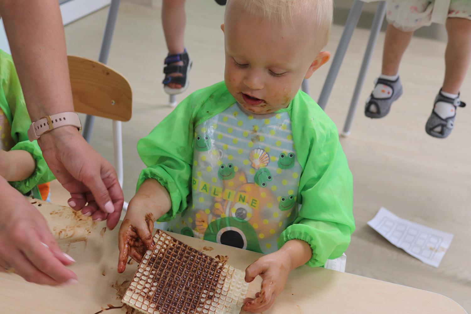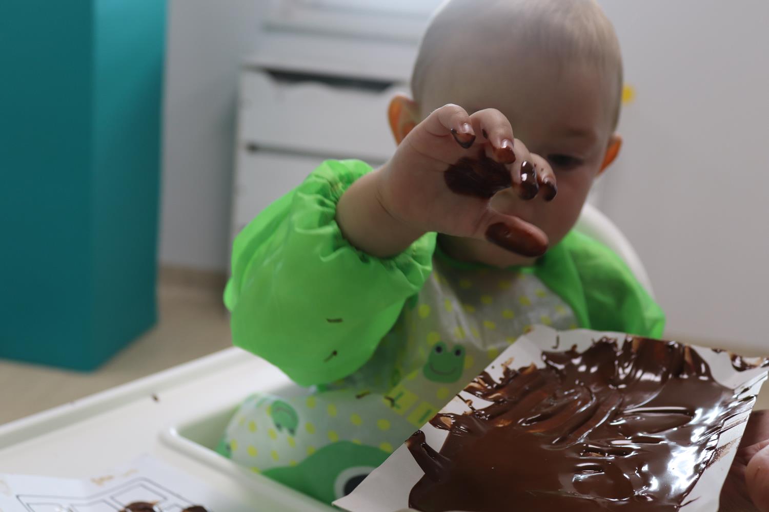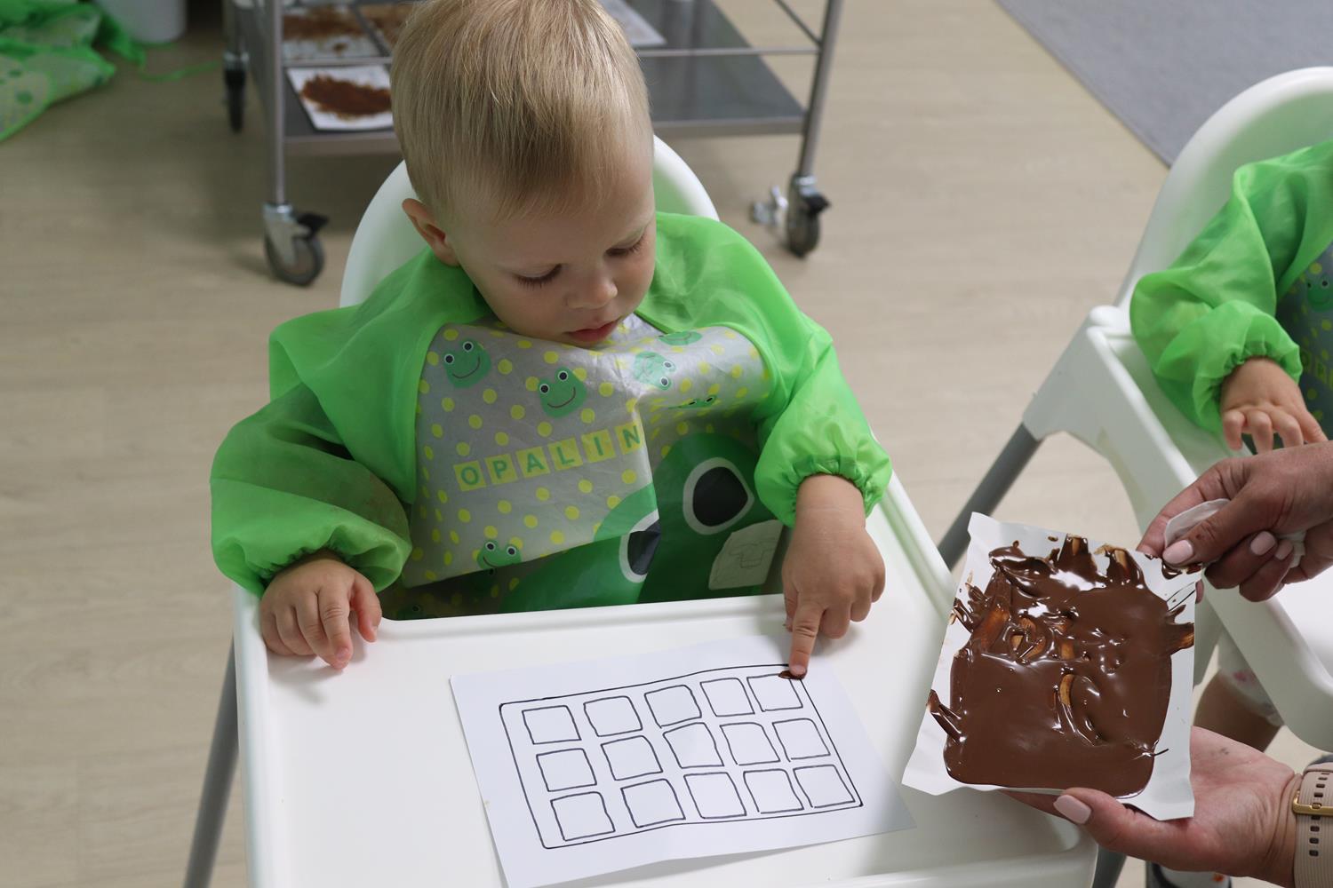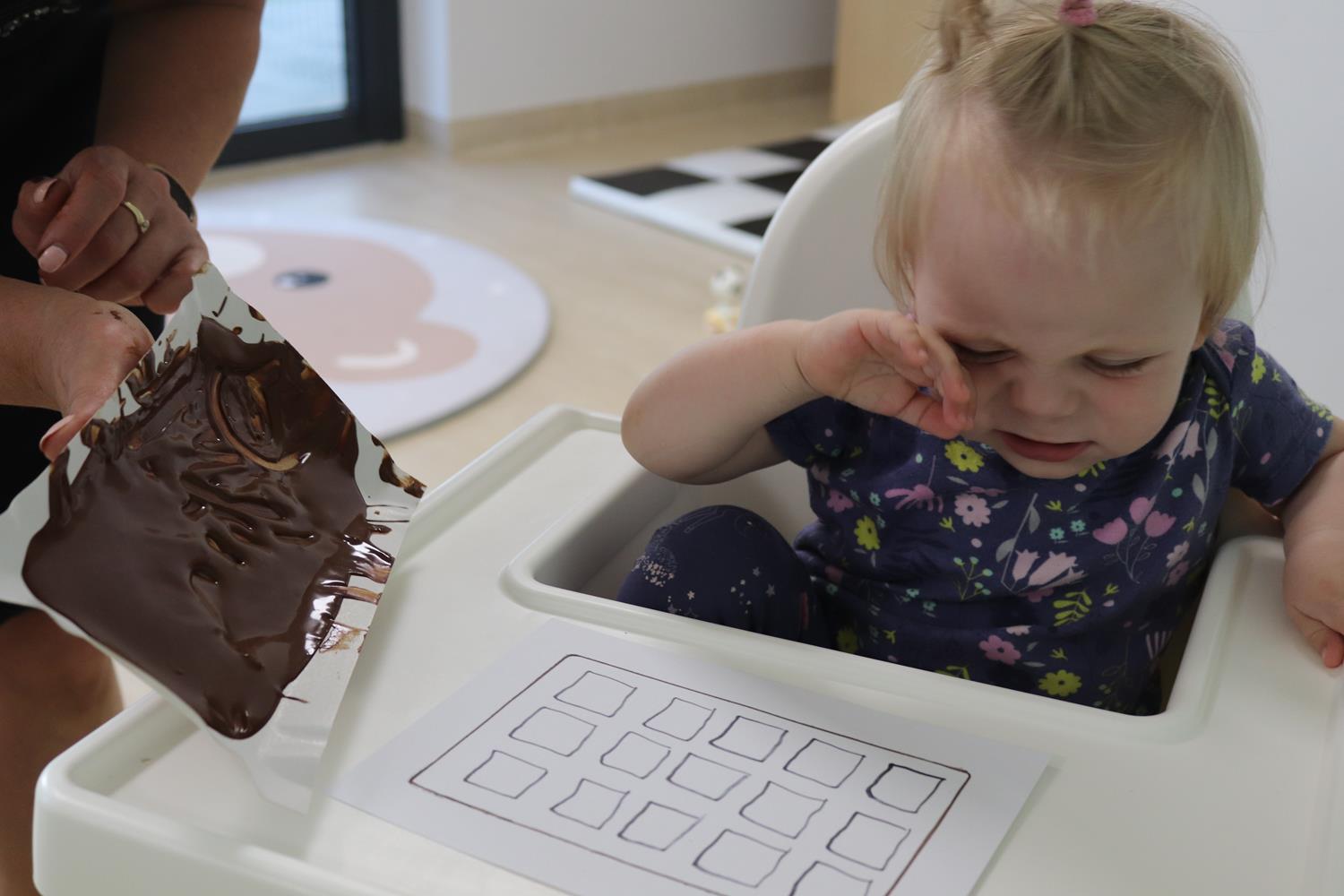 Każdy maluszek wykonał czekoladowy rysunek na kartce i na waflu według własnej fantazji i przy użyciu tylko dłoni. Nic w tym dziwnego, że palce trafiały raz na wafel a raz do buzi… 😋