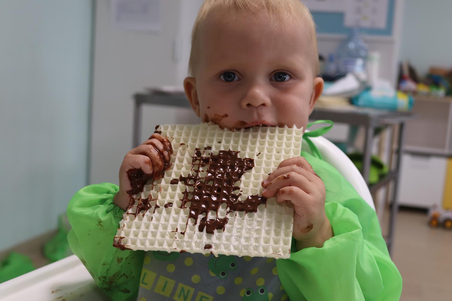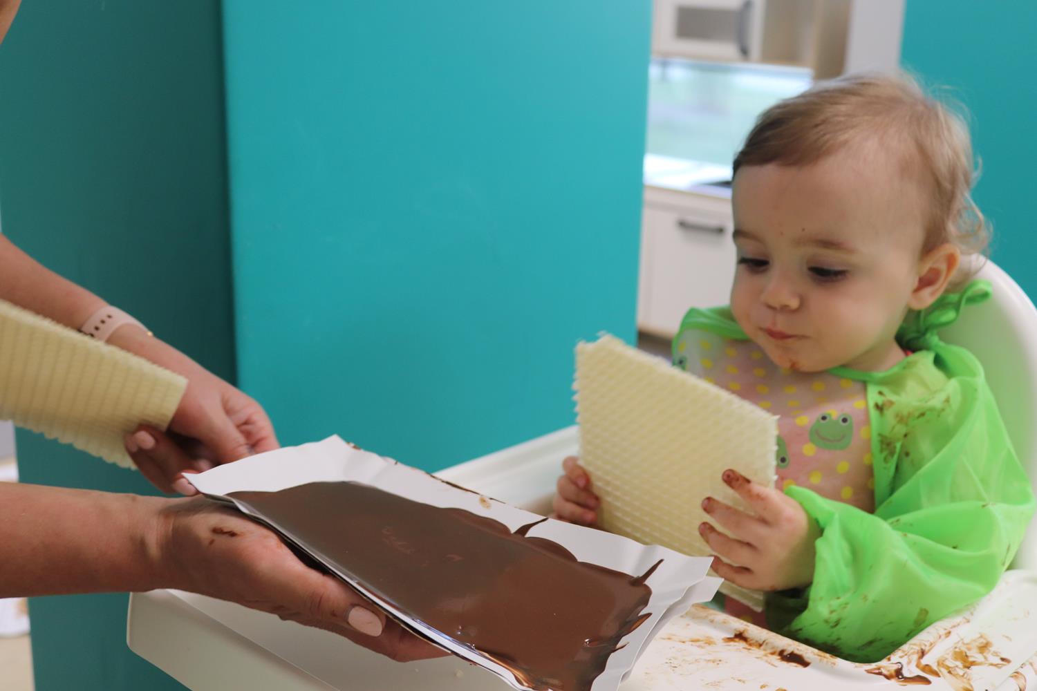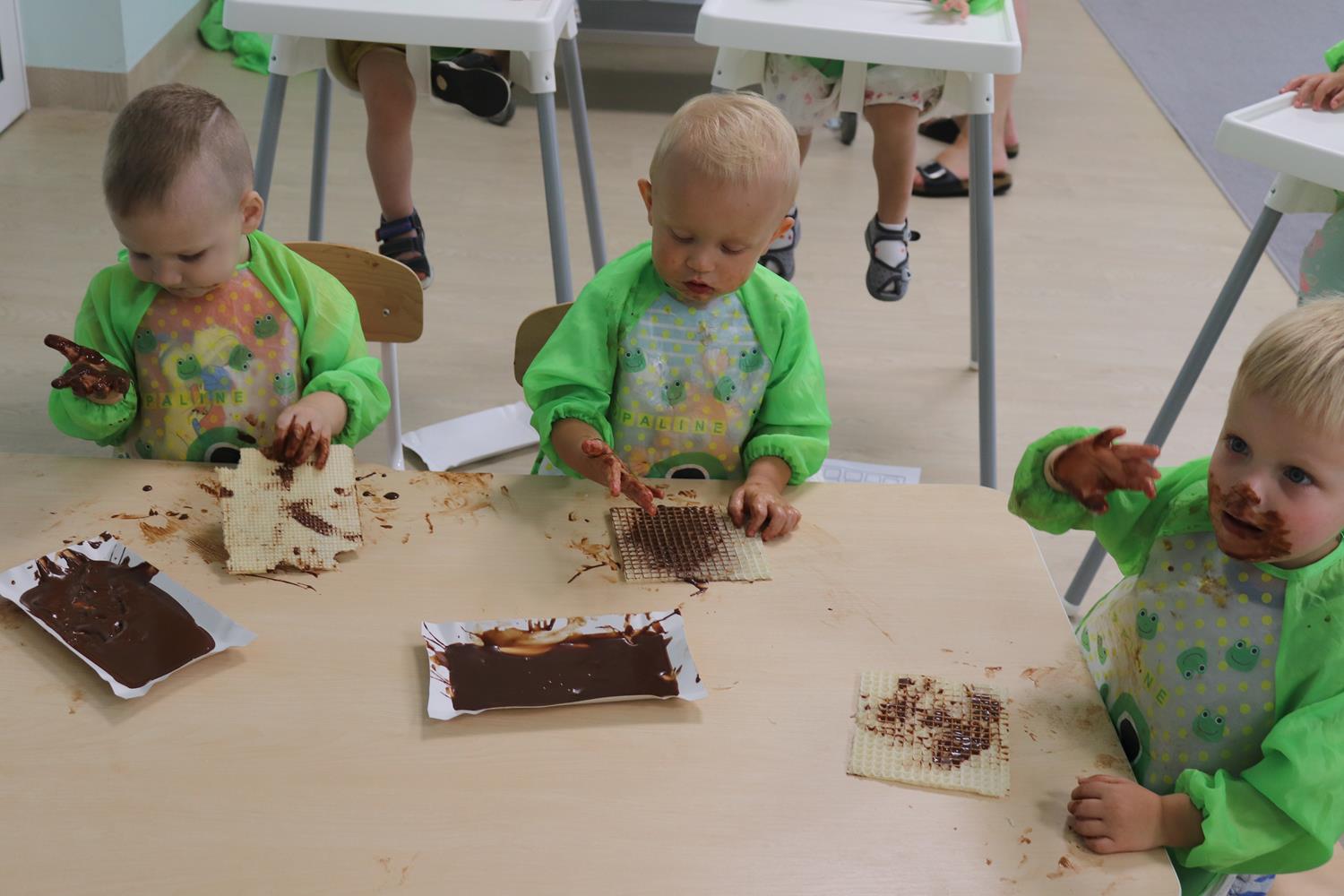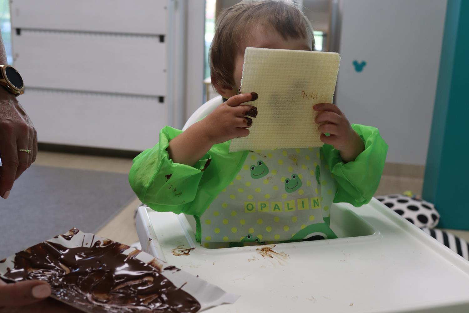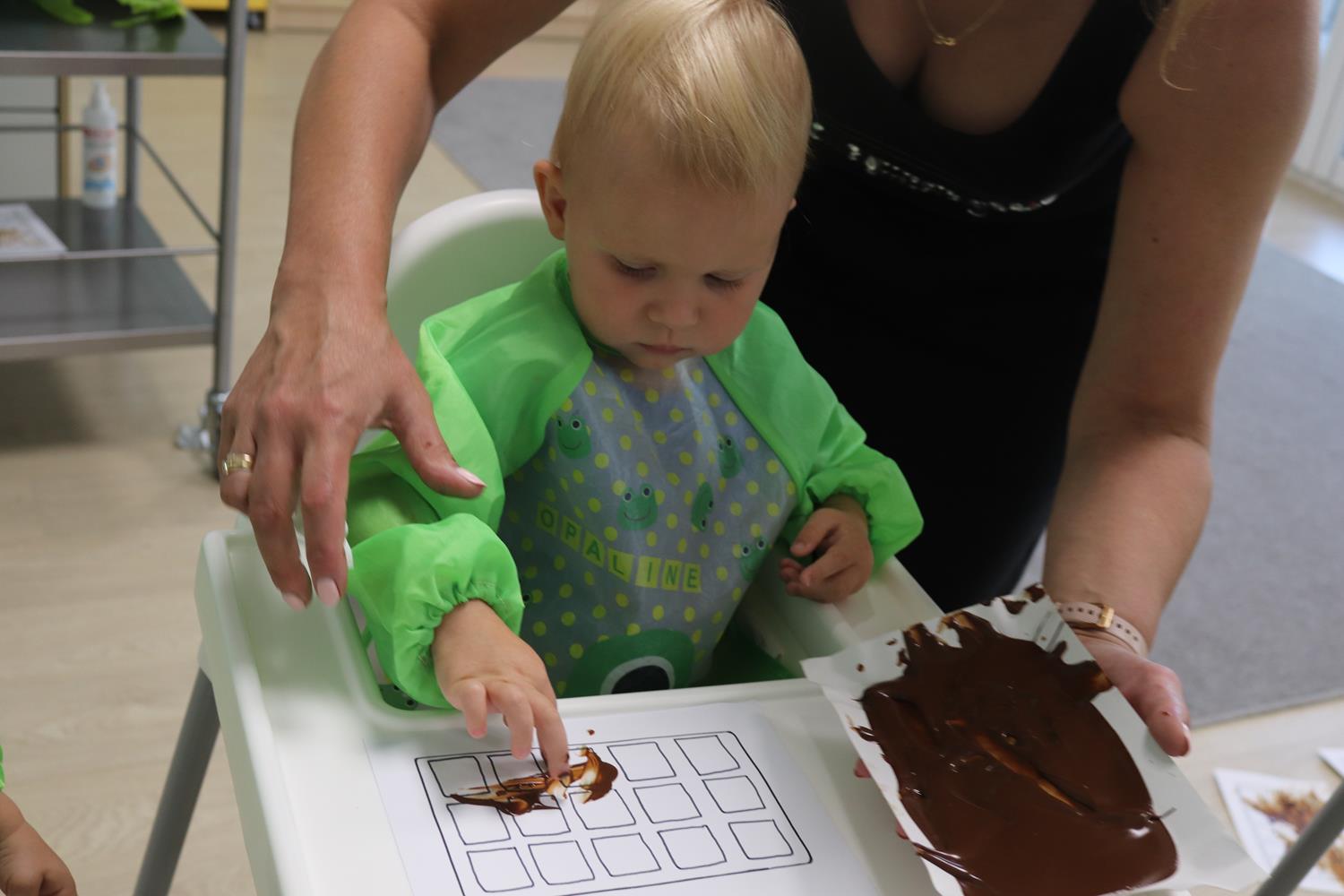 Każdy maluszek wykonał czekoladowy rysunek na kartce i na waflu według własnej fantazji i przy użyciu tylko dłoni. Nic w tym dziwnego, że palce trafiały raz na wafel a raz do buzi… 😋