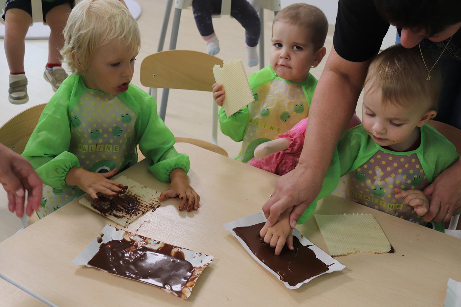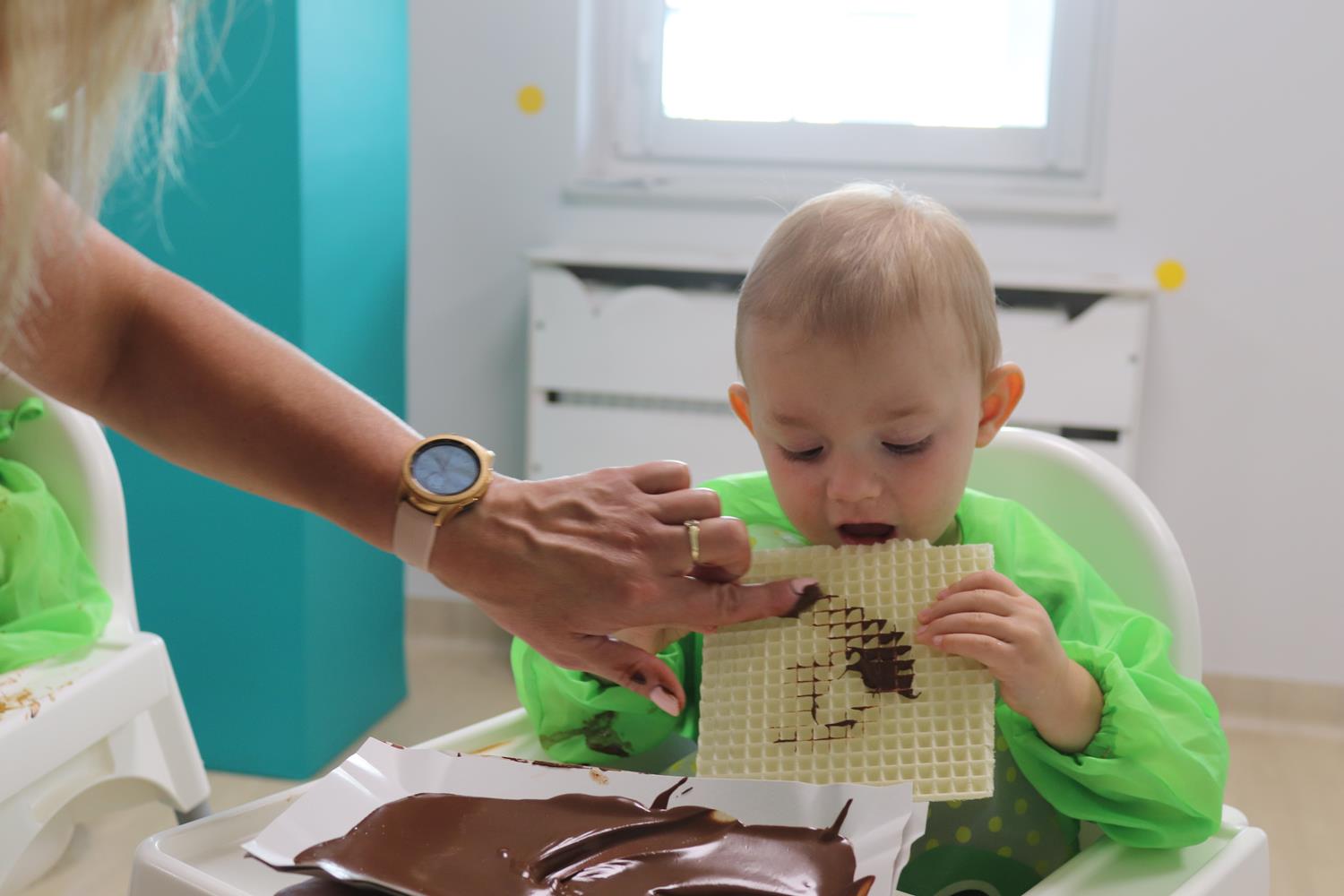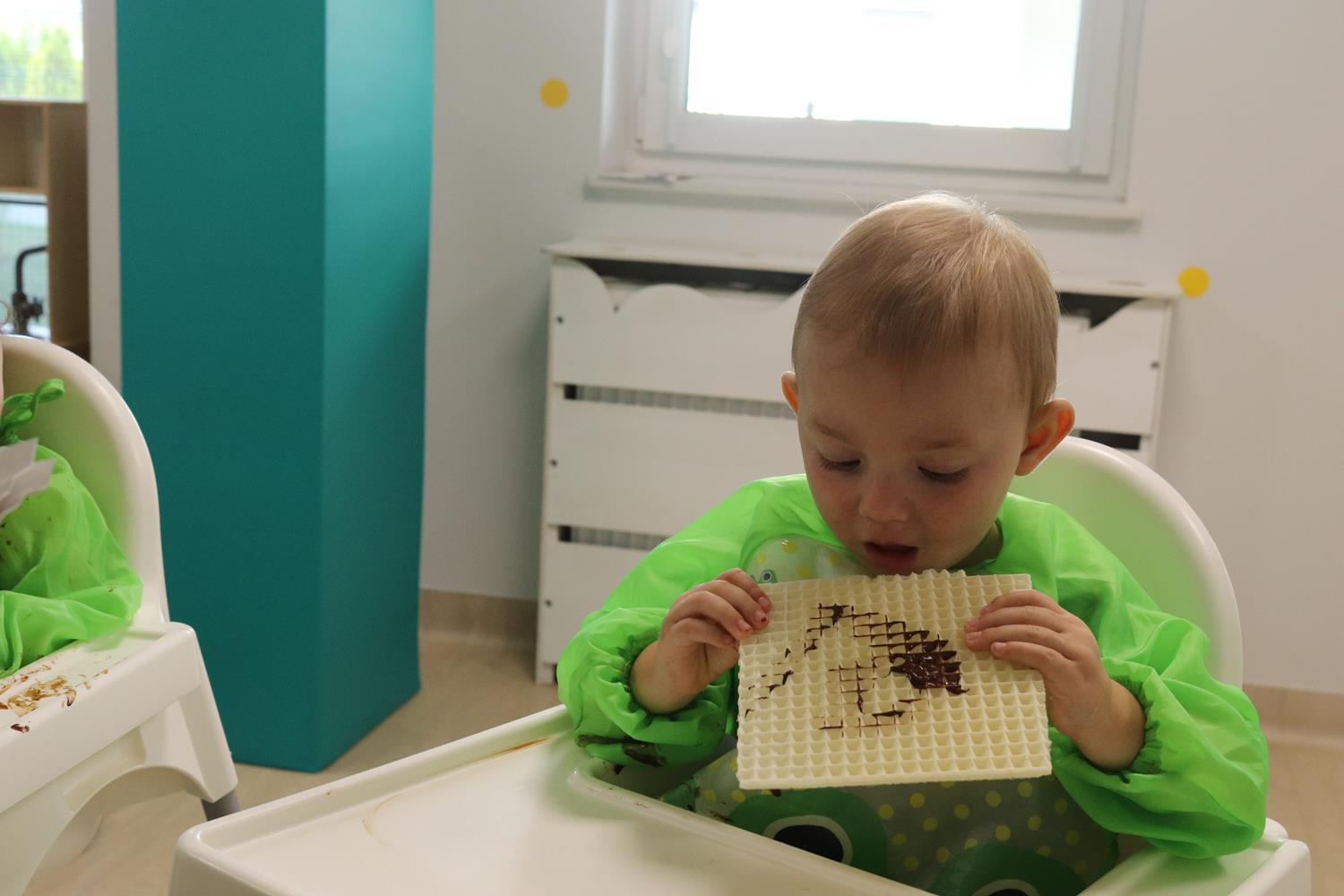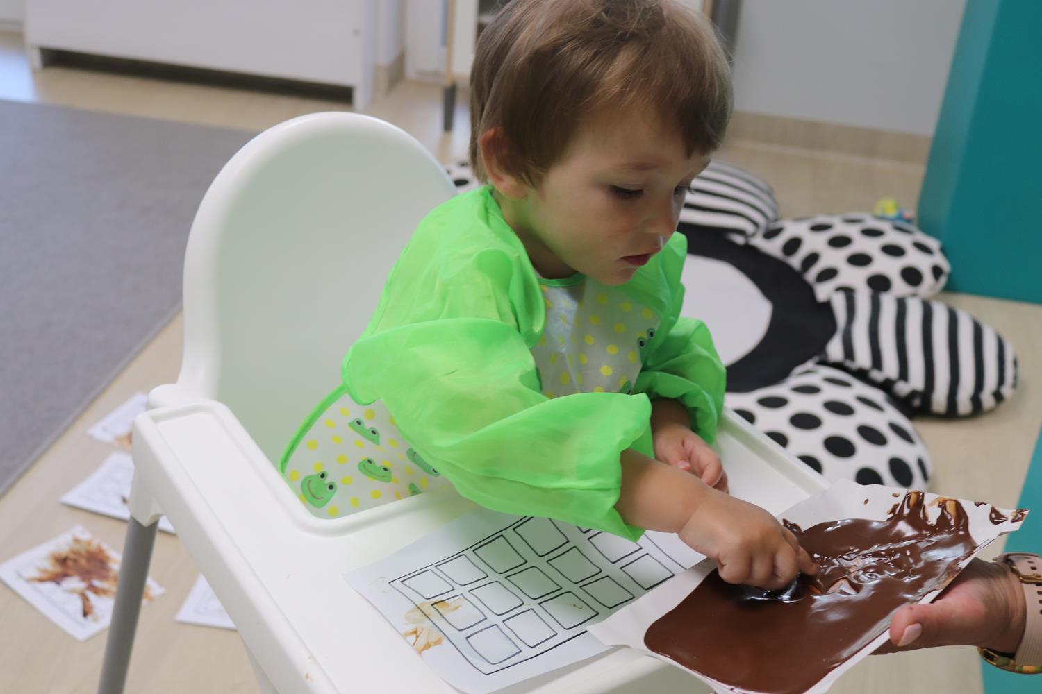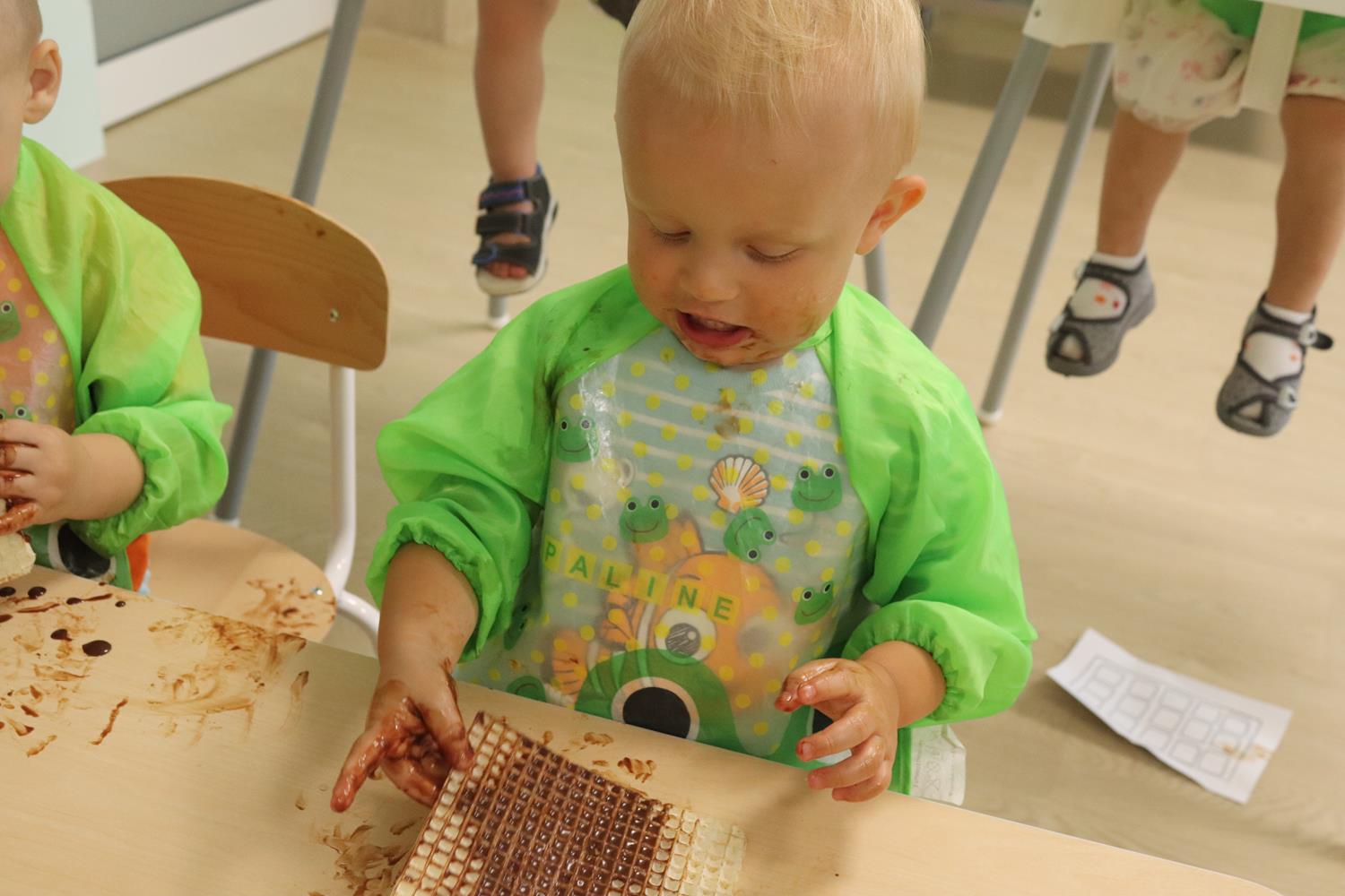 Każdy maluszek wykonał czekoladowy rysunek na kartce i na waflu według własnej fantazji i przy użyciu tylko dłoni. Nic w tym dziwnego, że palce trafiały raz na wafel a raz do buzi… 😋