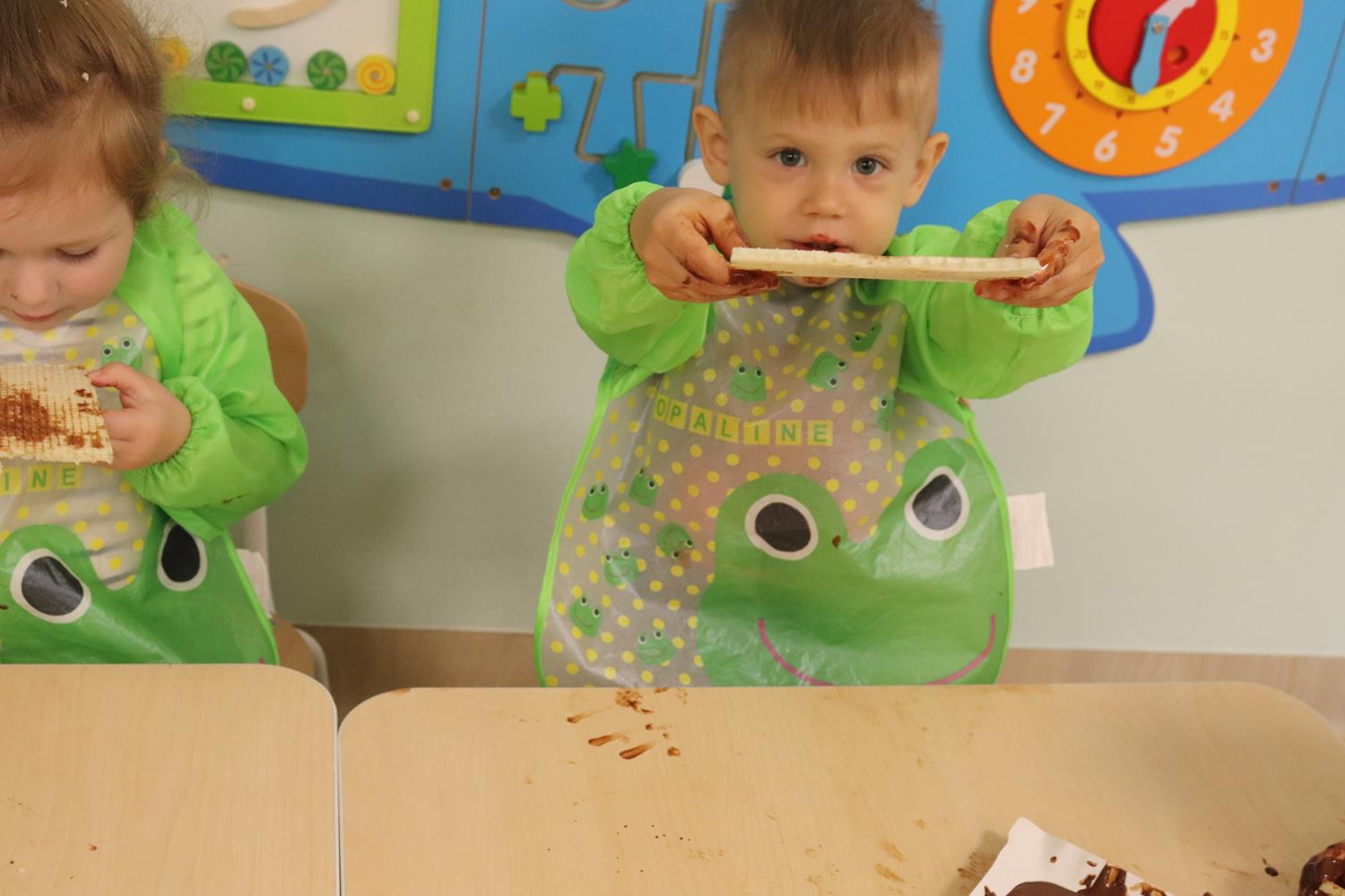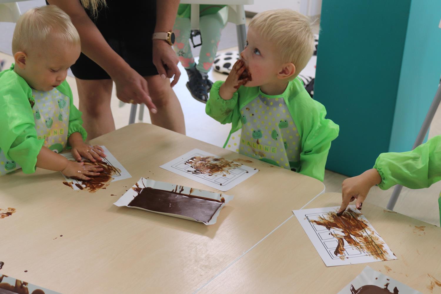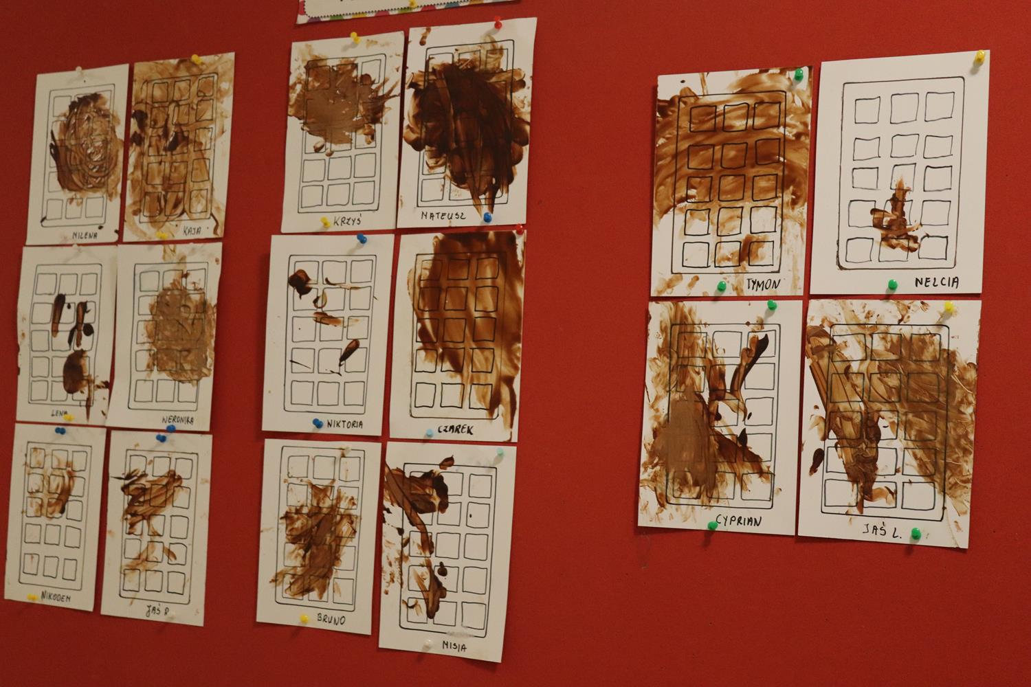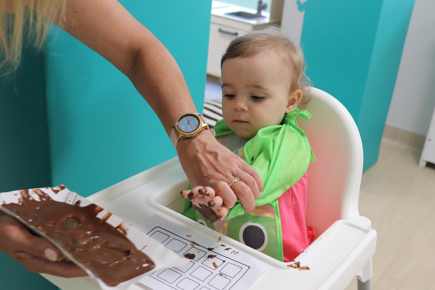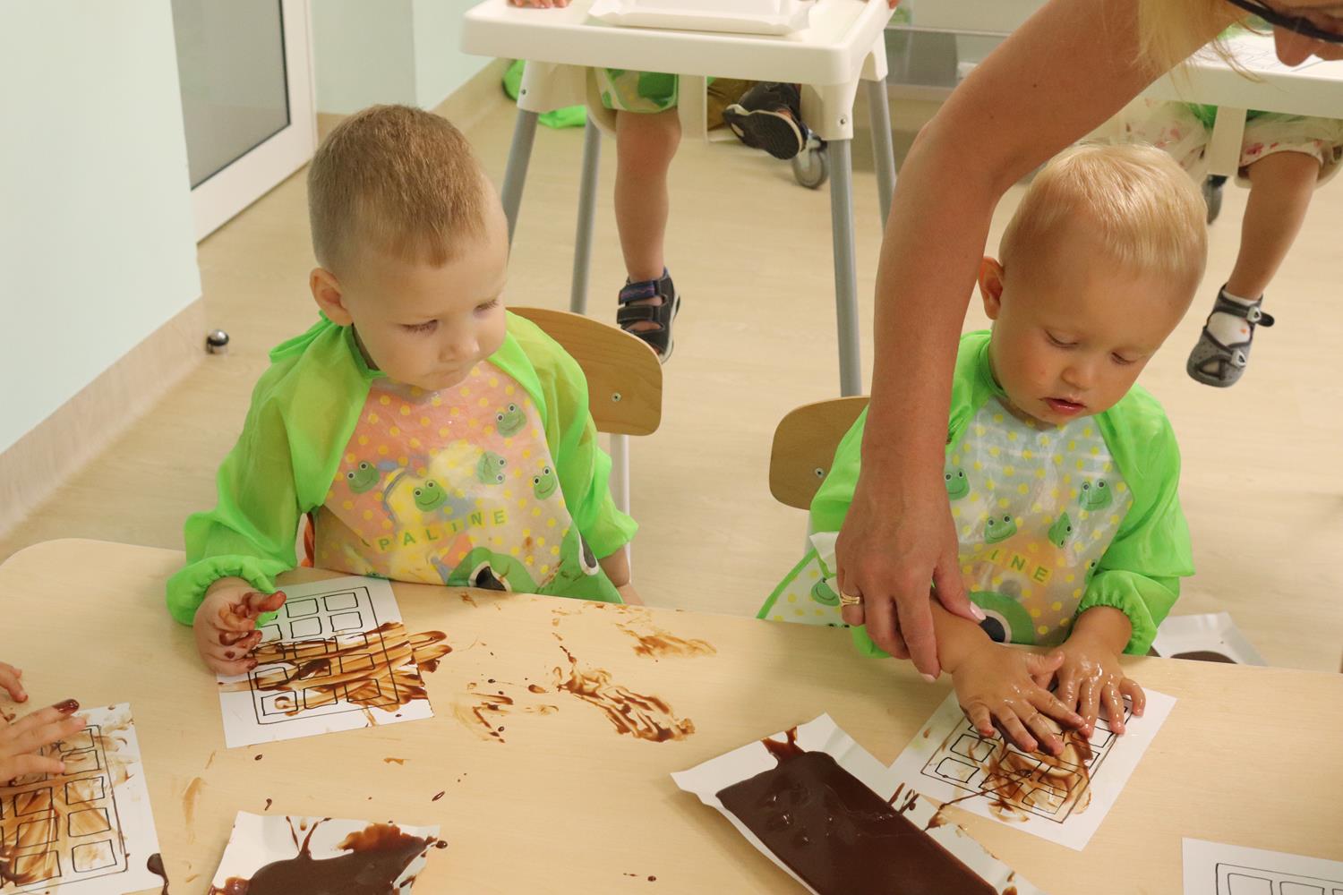 Każdy maluszek wykonał czekoladowy rysunek na kartce i na waflu według własnej fantazji i przy użyciu tylko dłoni. Nic w tym dziwnego, że palce trafiały raz na wafel a raz do buzi… 😋