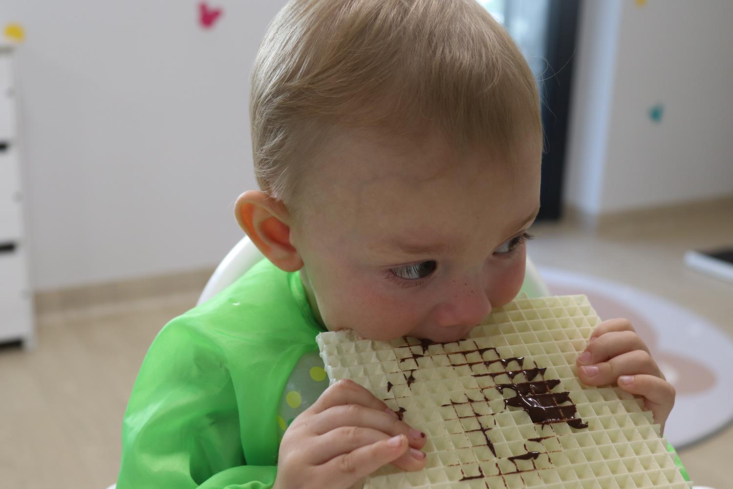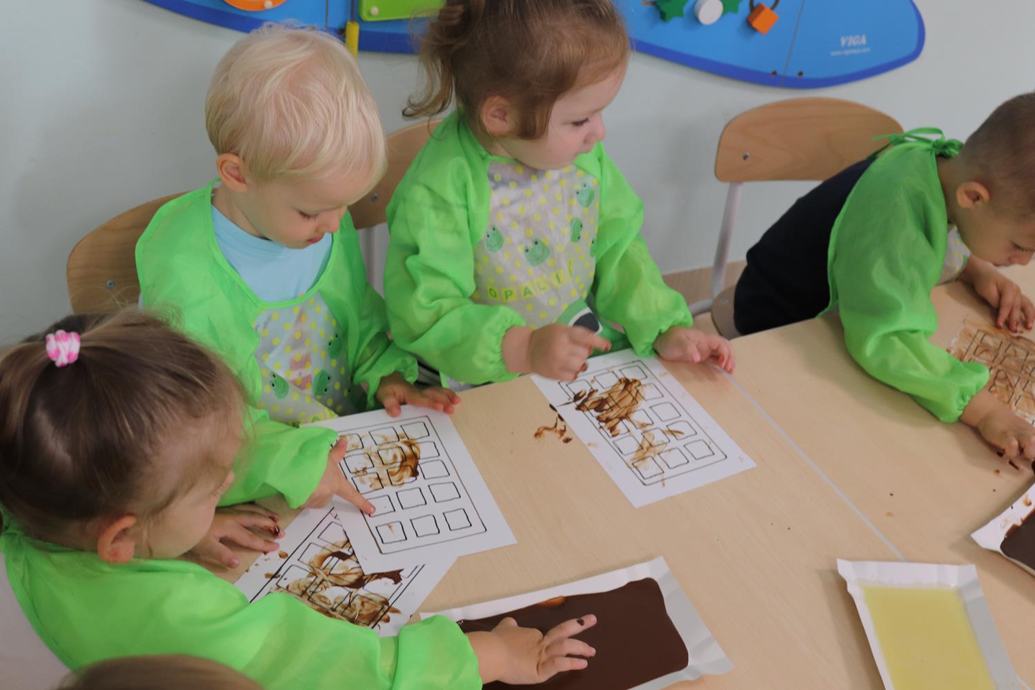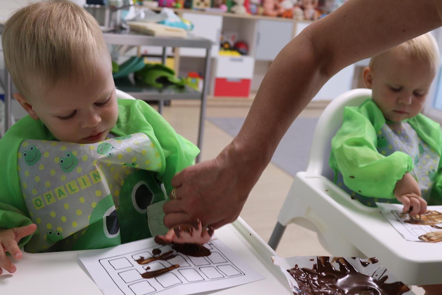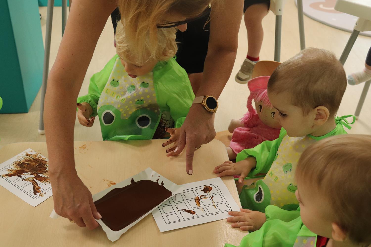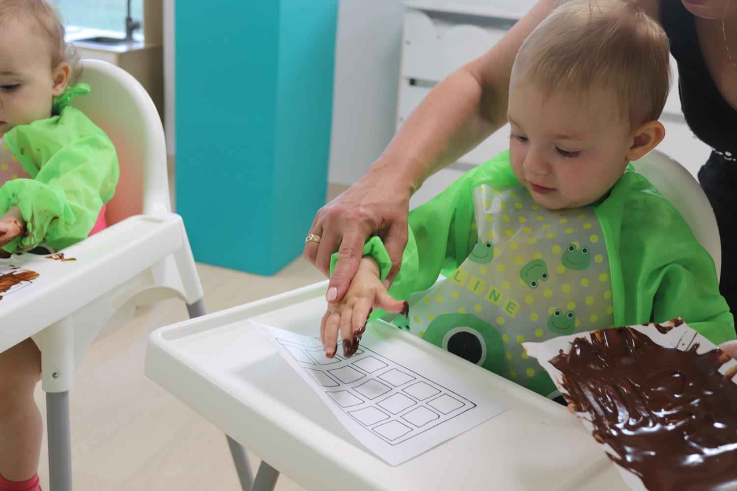 Każdy maluszek wykonał czekoladowy rysunek na kartce i na waflu według własnej fantazji i przy użyciu tylko dłoni. Nic w tym dziwnego, że palce trafiały raz na wafel a raz do buzi… 😋