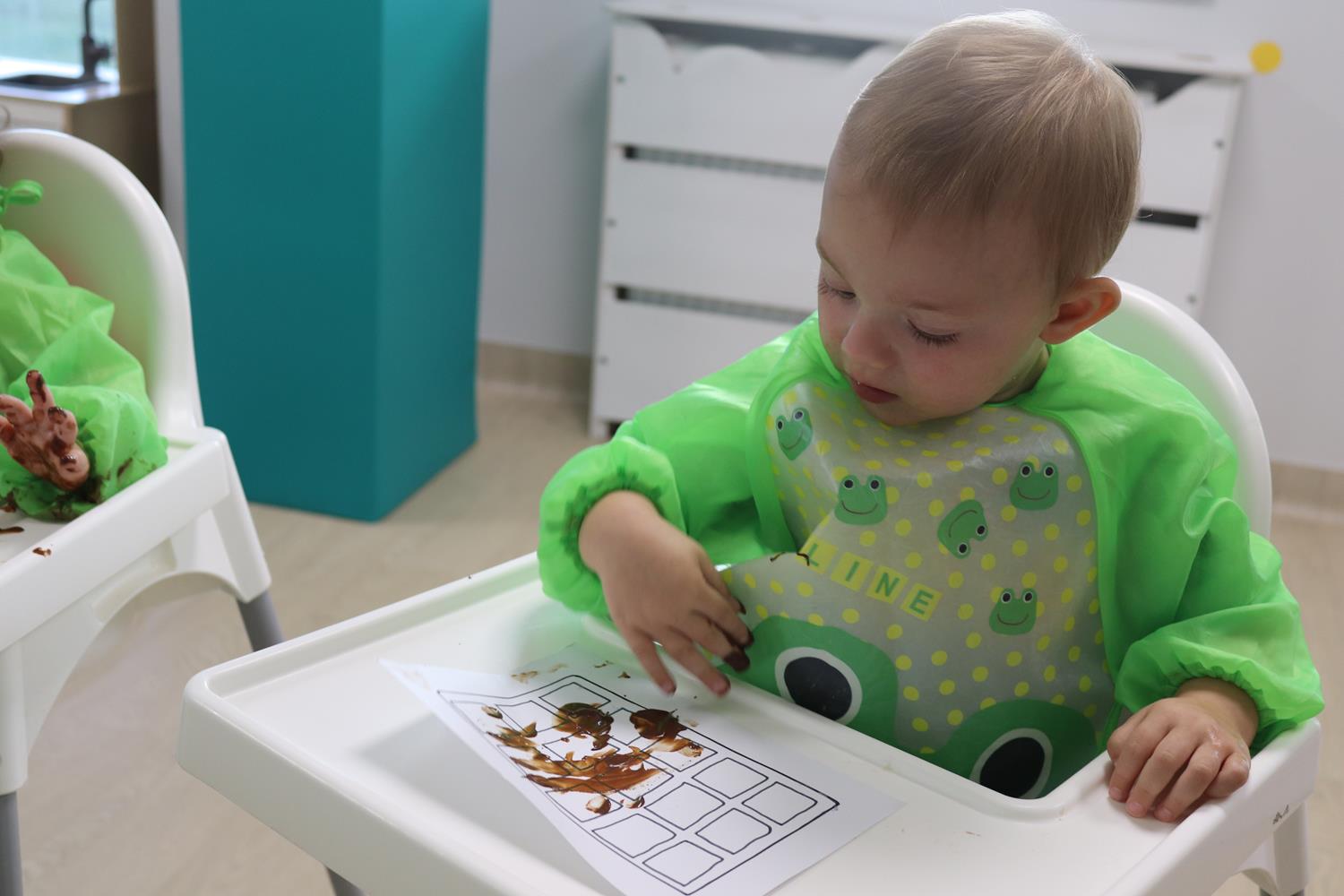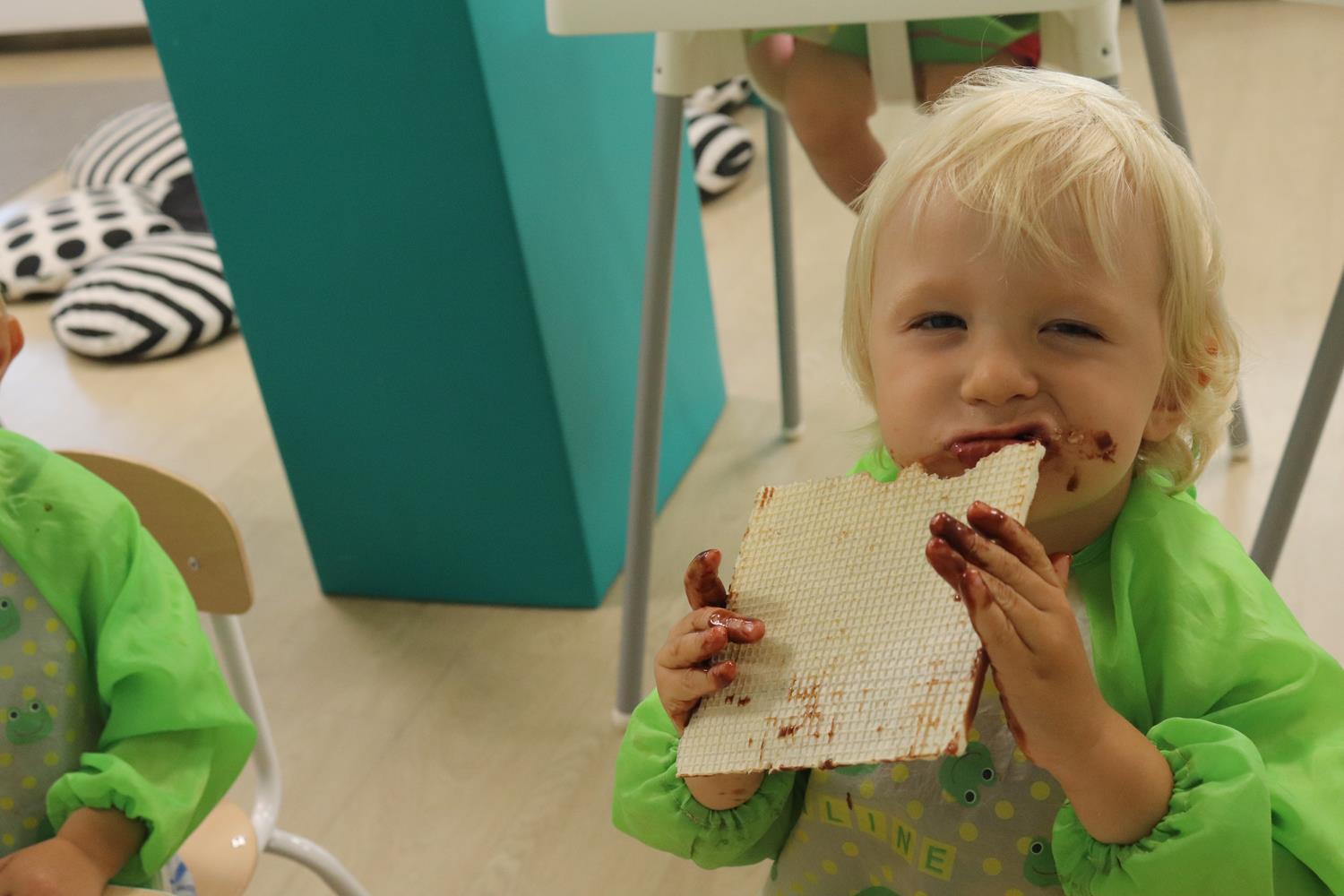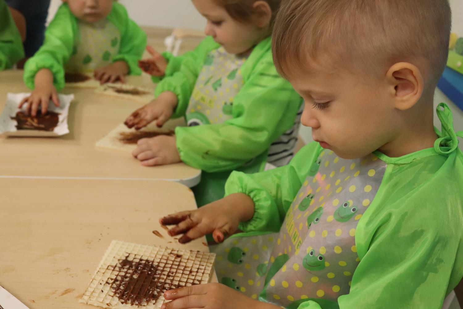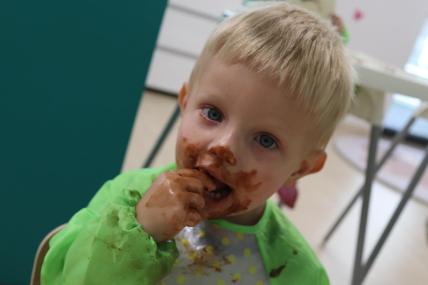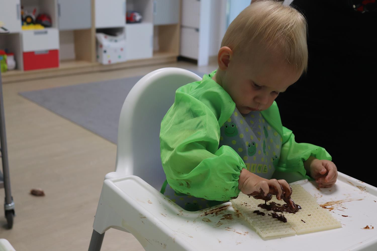 Każdy maluszek wykonał czekoladowy rysunek na kartce i na waflu według własnej fantazji i przy użyciu tylko dłoni. Nic w tym dziwnego, że palce trafiały raz na wafel a raz do buzi… 😋