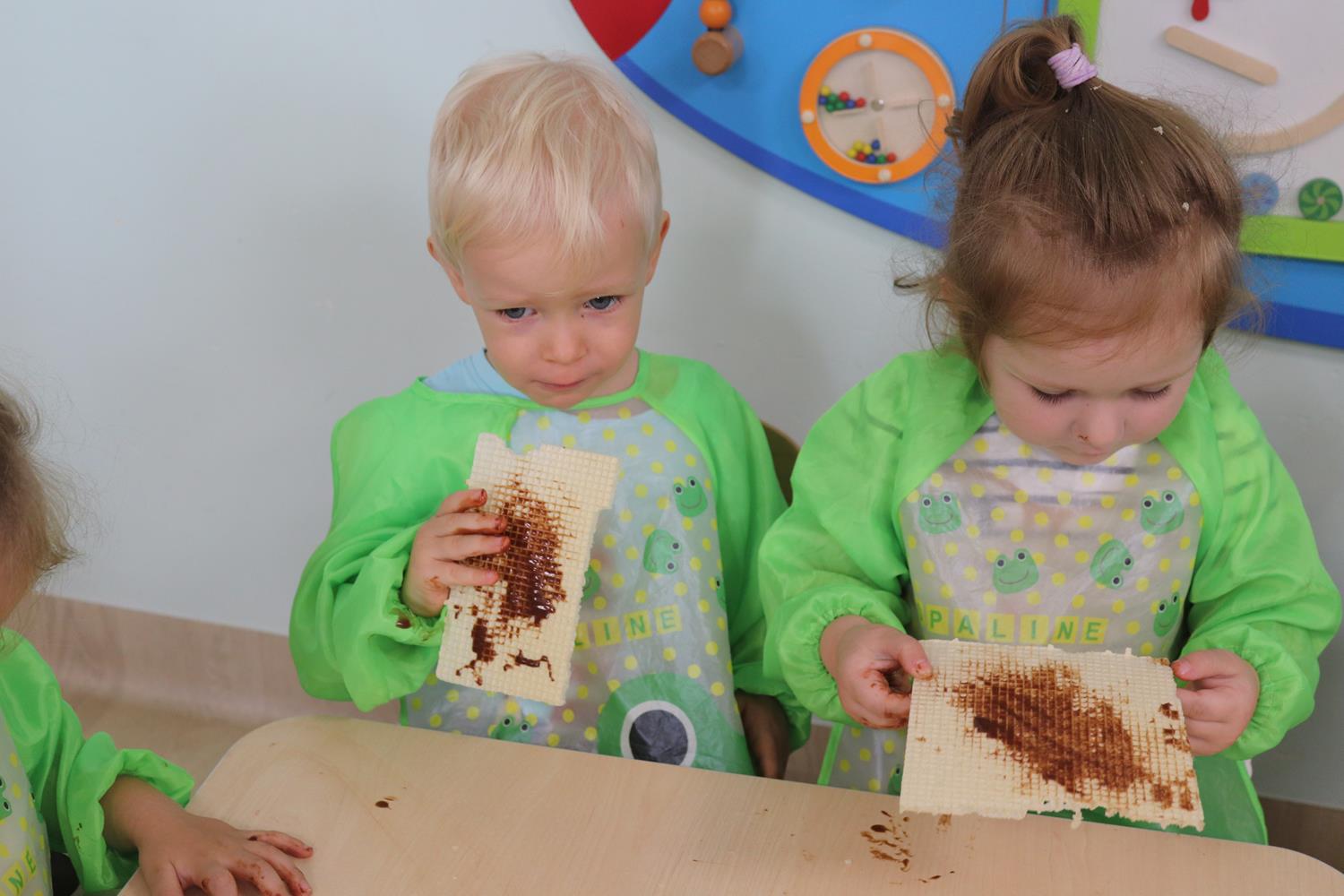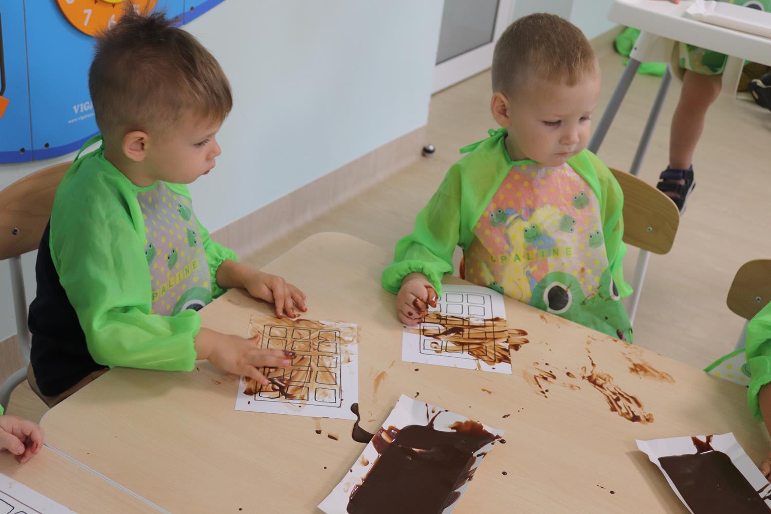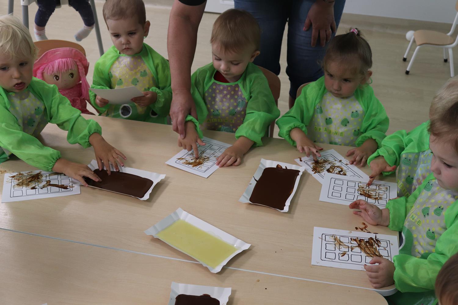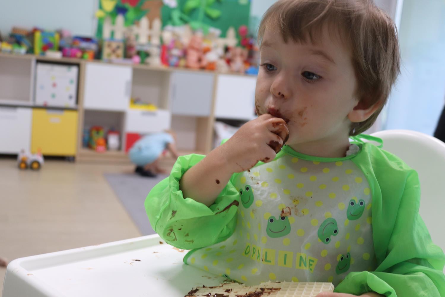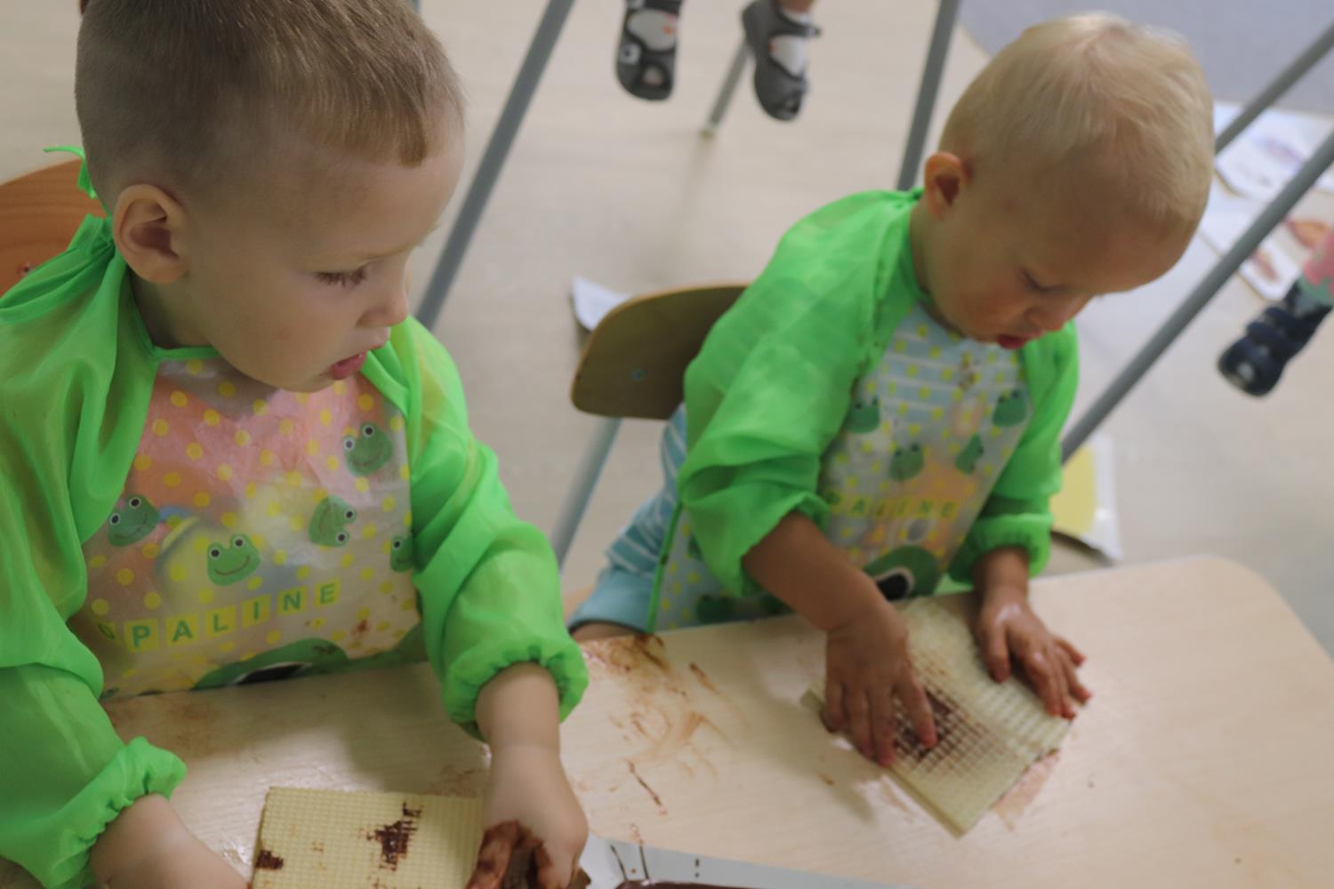 Każdy maluszek wykonał czekoladowy rysunek na kartce i na waflu według własnej fantazji i przy użyciu tylko dłoni. Nic w tym dziwnego, że palce trafiały raz na wafel a raz do buzi… 😋