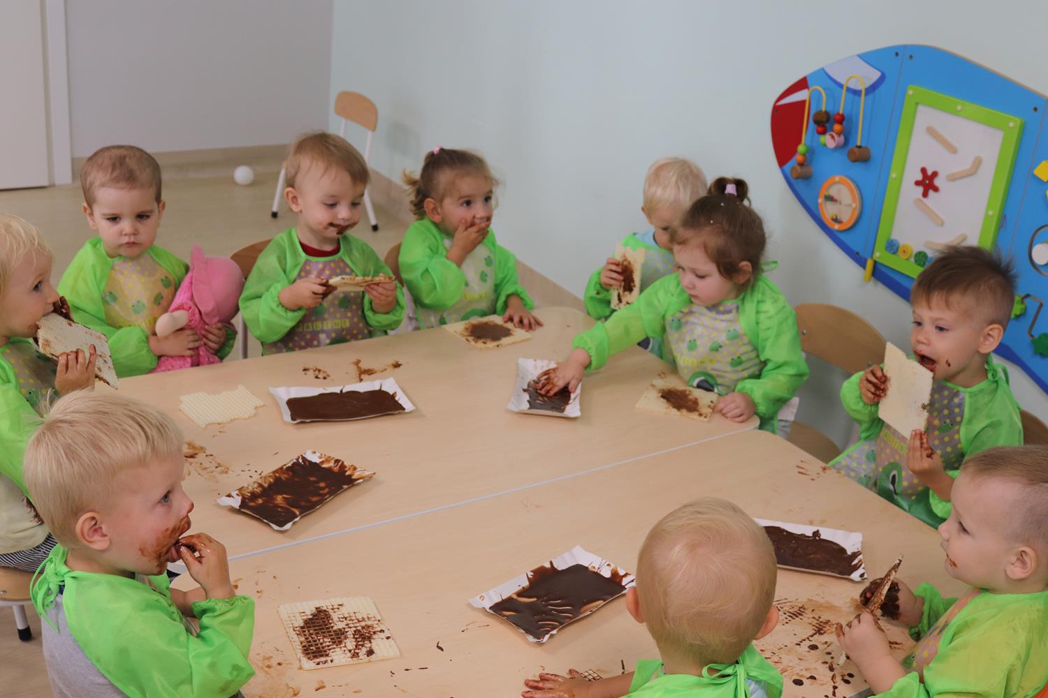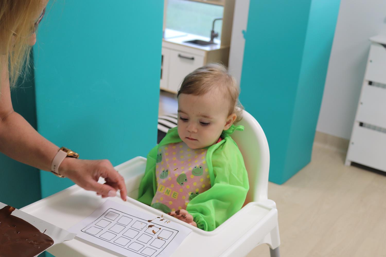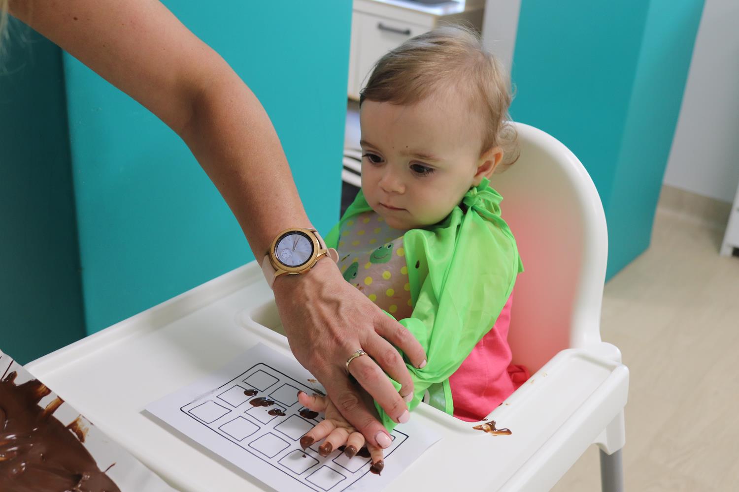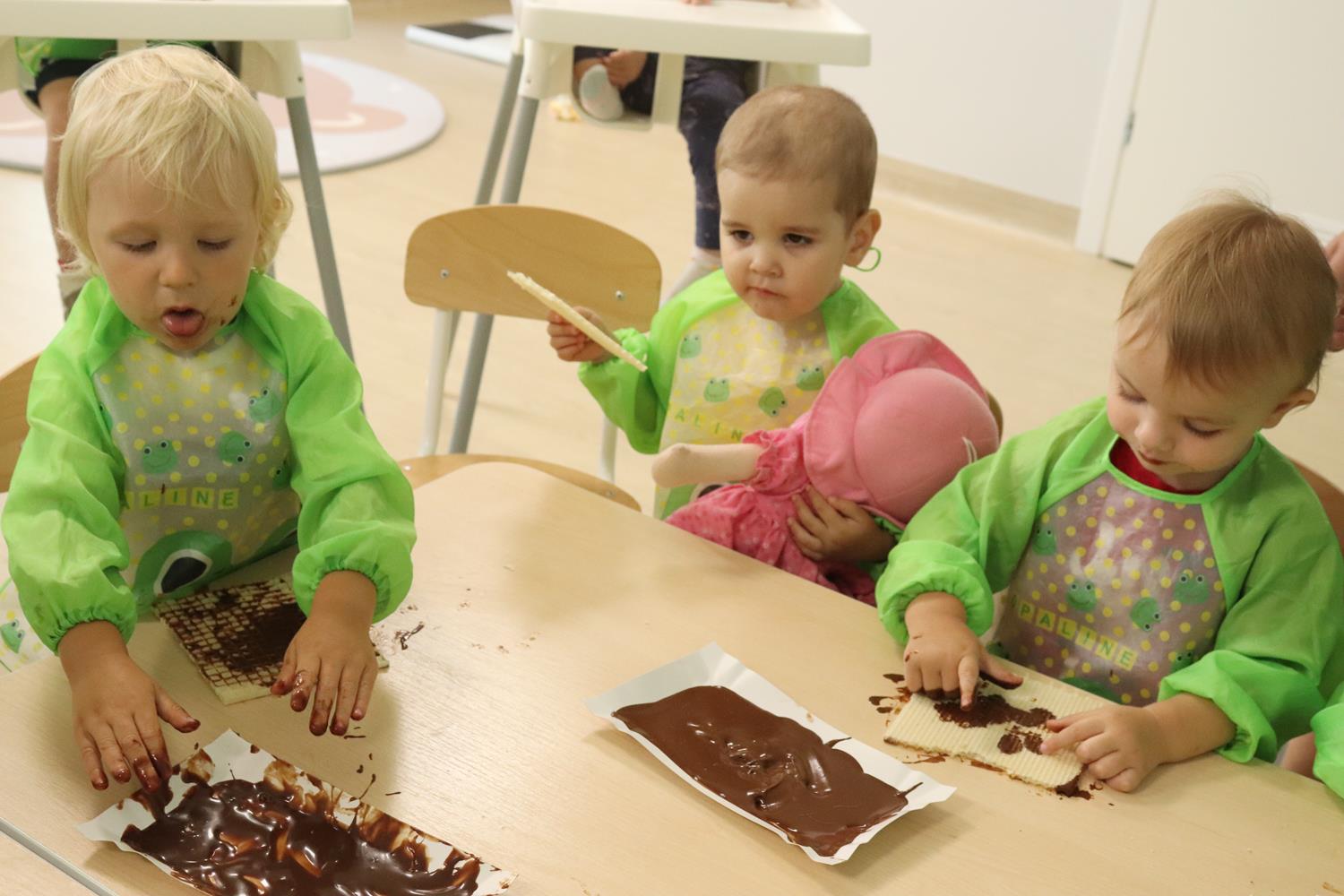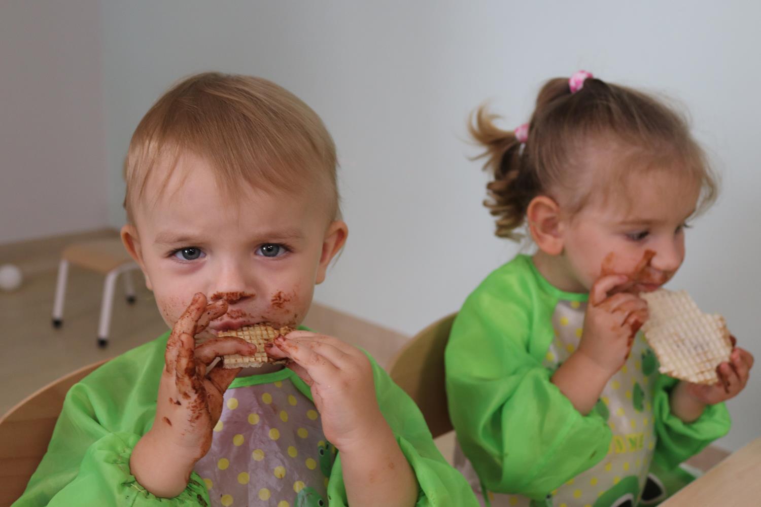 Każdy maluszek wykonał czekoladowy rysunek na kartce i na waflu według własnej fantazji i przy użyciu tylko dłoni. Nic w tym dziwnego, że palce trafiały raz na wafel a raz do buzi… 😋