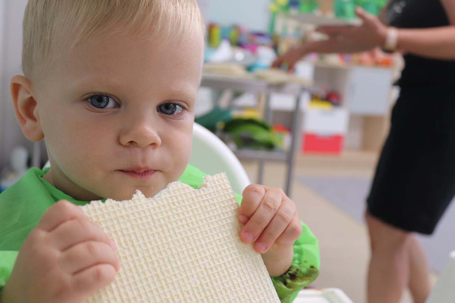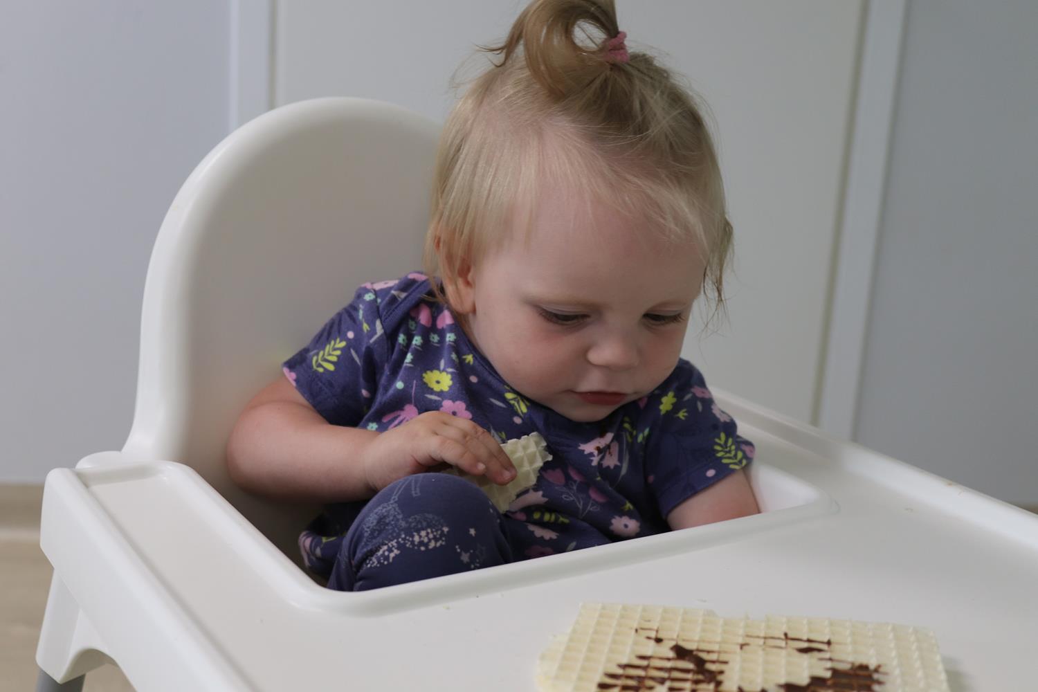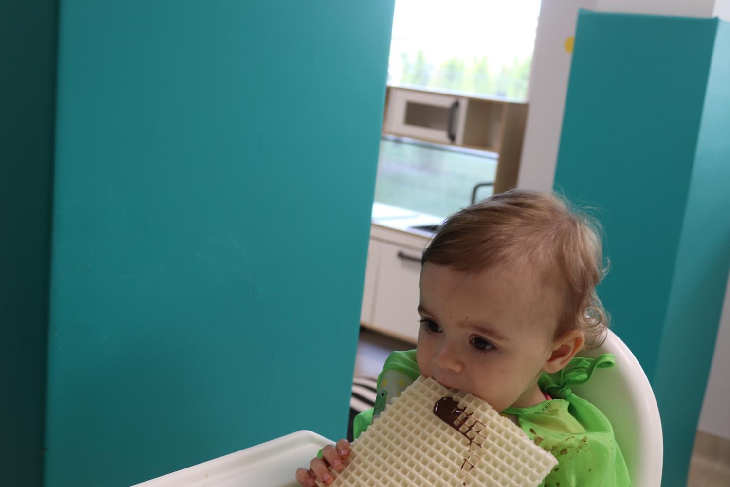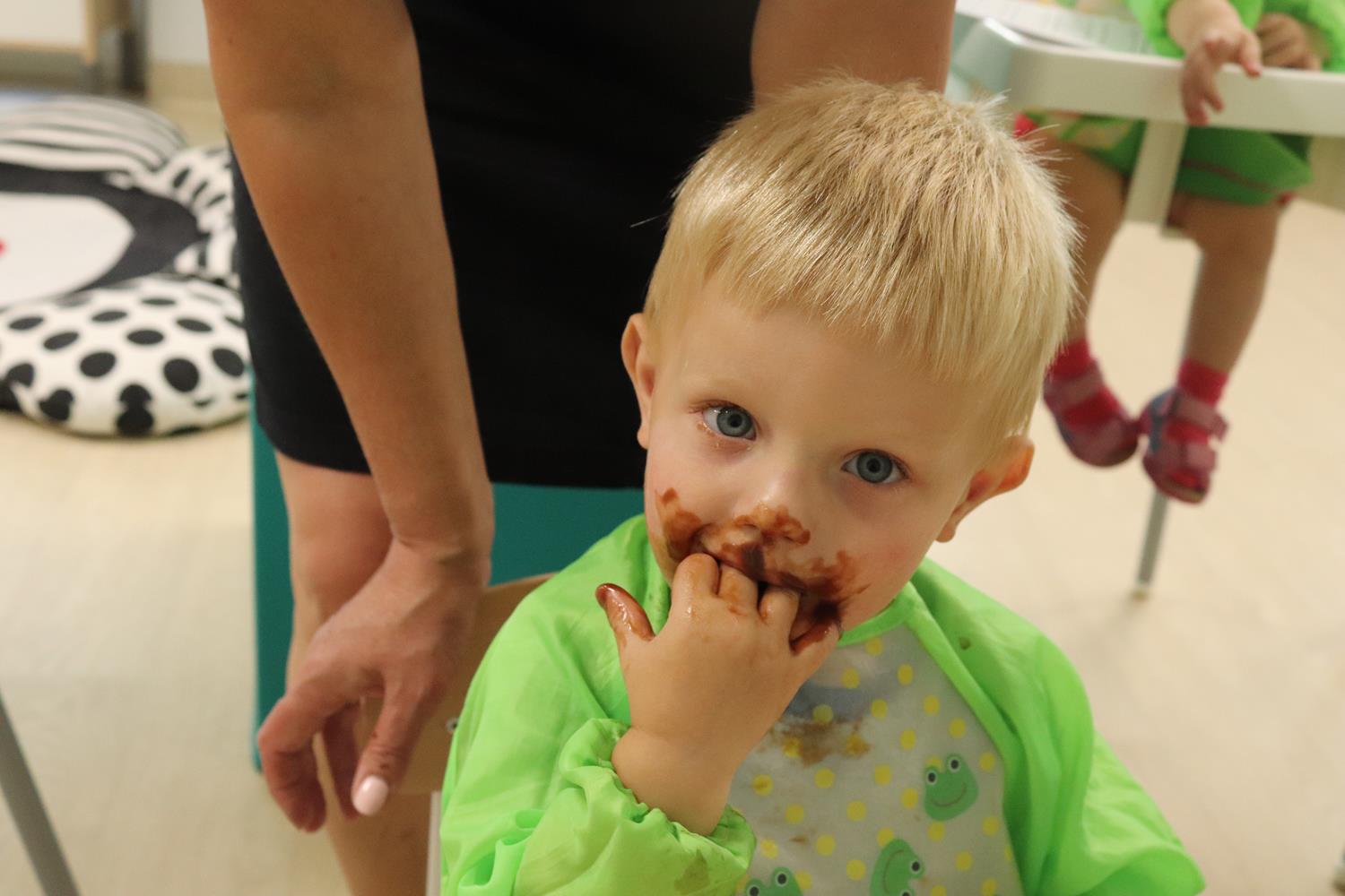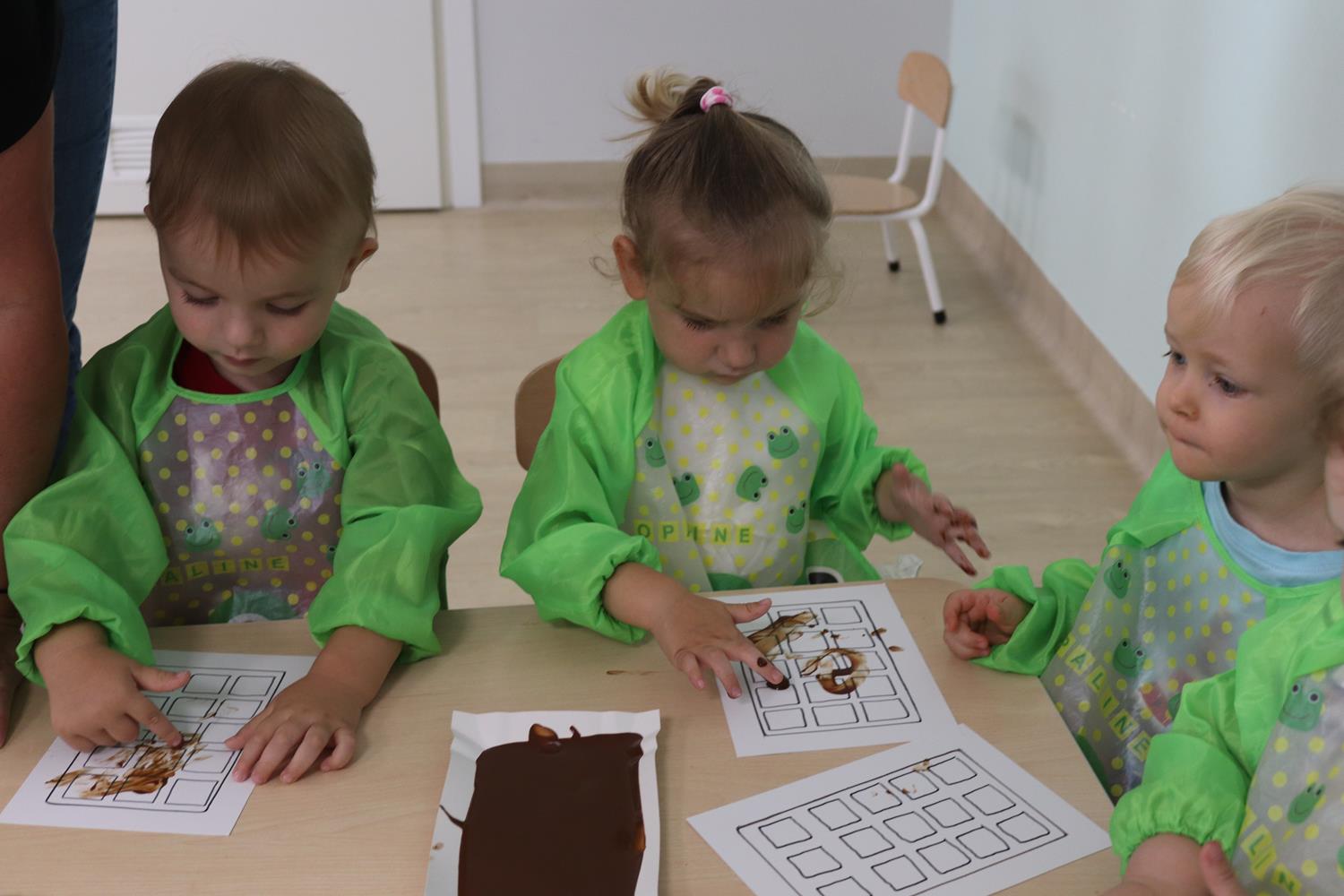 Każdy maluszek wykonał czekoladowy rysunek na kartce i na waflu według własnej fantazji i przy użyciu tylko dłoni. Nic w tym dziwnego, że palce trafiały raz na wafel a raz do buzi… 😋