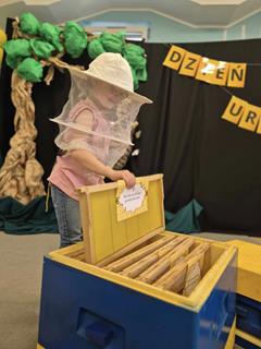 w przyrodzie oraz znaczenia ich pracy dla środowiska i człowieka. Dzieci miały okazję zobaczyć, jak wygląda ul oraz dowiedzieć się, jak funkcjonuje pszczela społeczność – kim jest królowa