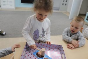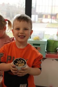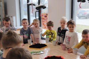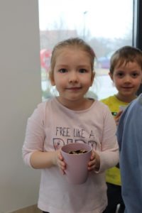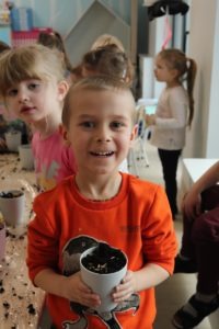 , po krótkim wprowadzeniu dotyczącym czynności, jakie trzeba wykonać przy sianiu owsa zabrały się do pracy. Zajęcie to nauczyło dzieci jak należy siać owies i co jest potrzebne do jego wzrostu. Wielkanocne minidoniczki zostały ustawione na parapecie po wcześniejszym podlaniu wodą