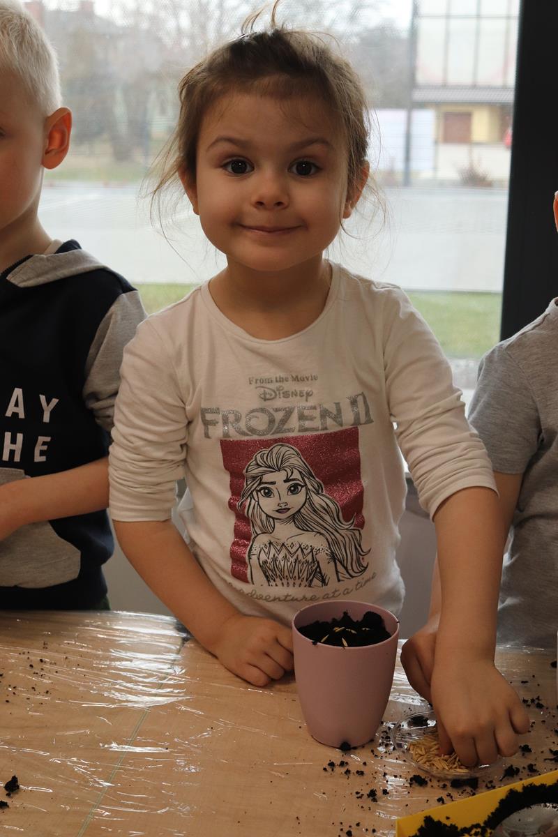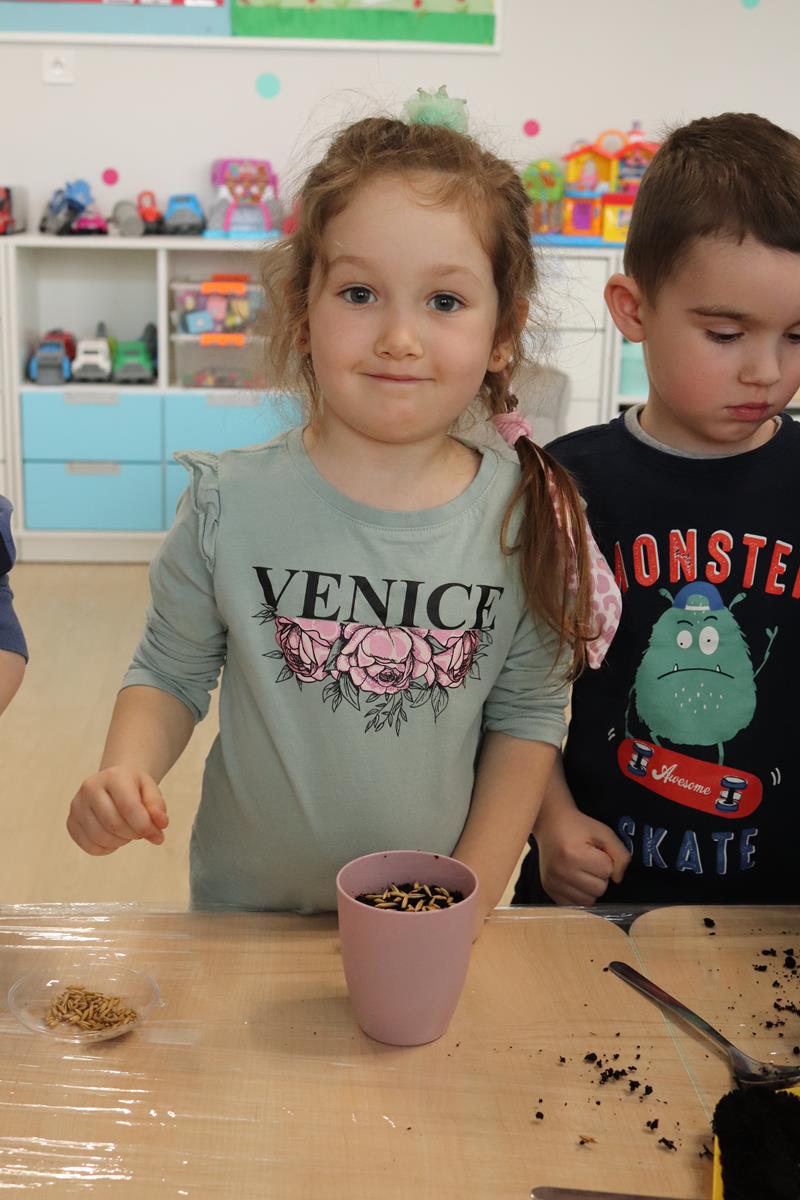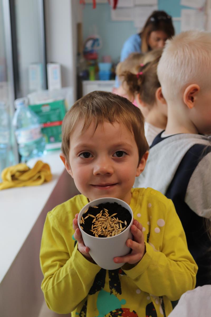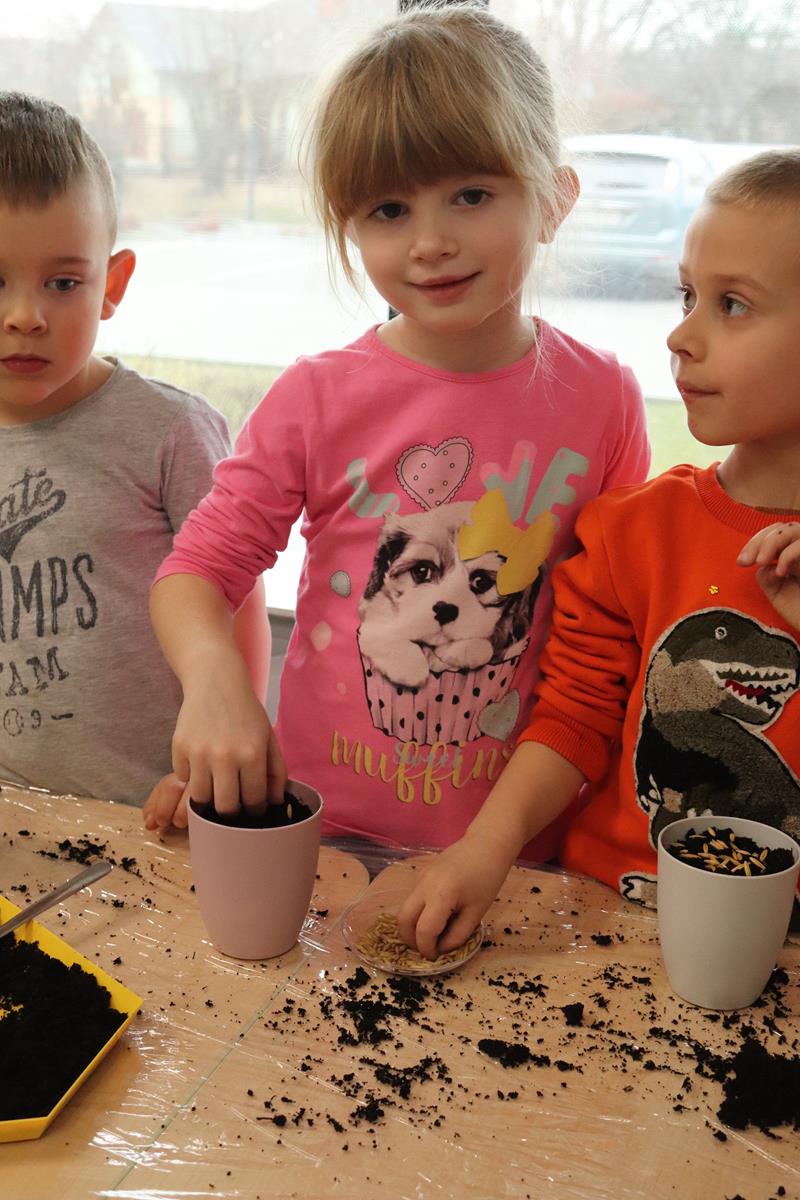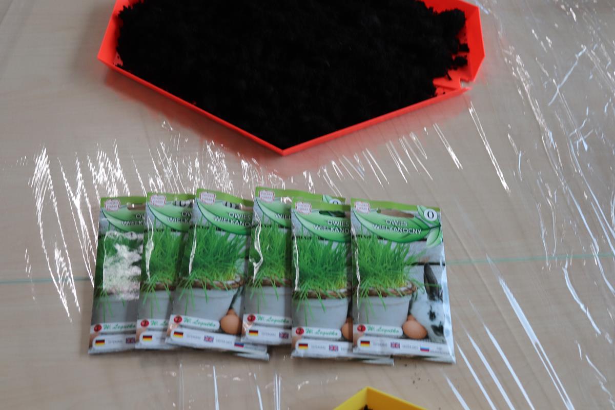 , po krótkim wprowadzeniu dotyczącym czynności, jakie trzeba wykonać przy sianiu owsa zabrały się do pracy. Zajęcie to nauczyło dzieci jak należy siać owies i co jest potrzebne do jego wzrostu. Wielkanocne minidoniczki zostały ustawione na parapecie po wcześniejszym podlaniu wodą