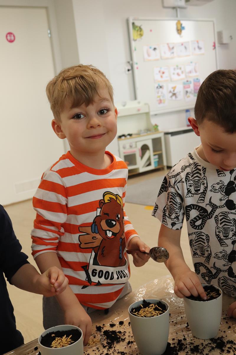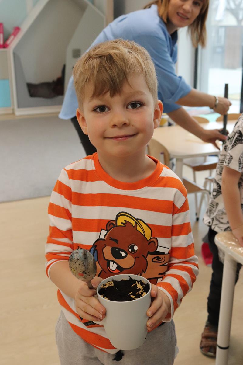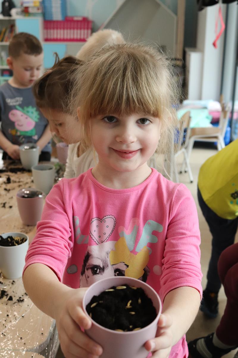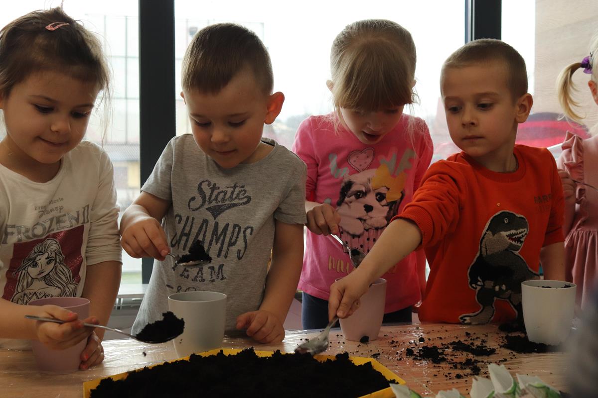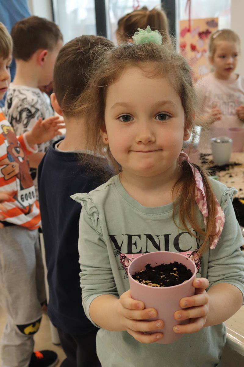 , po krótkim wprowadzeniu dotyczącym czynności, jakie trzeba wykonać przy sianiu owsa zabrały się do pracy. Zajęcie to nauczyło dzieci jak należy siać owies i co jest potrzebne do jego wzrostu. Wielkanocne minidoniczki zostały ustawione na parapecie po wcześniejszym podlaniu wodą