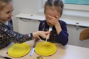 Na początku dzieci poznały zasady zdrowego odżywiania a następnie miały za zadanie odgadnąć jakim warzywem są częstowane przez swoich kolegów.