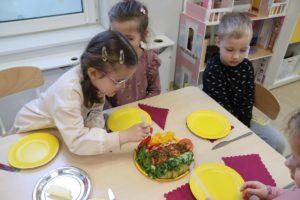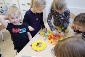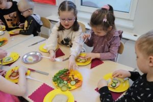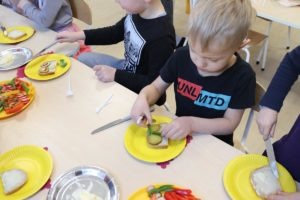Wszystkie dzieci z zaangażowaniem brały udział w zabawie oraz dobierały składniki tak, aby każda wykonana kanapka wyglądała wyjątkowo.