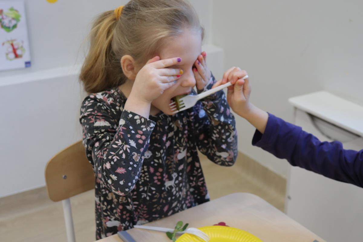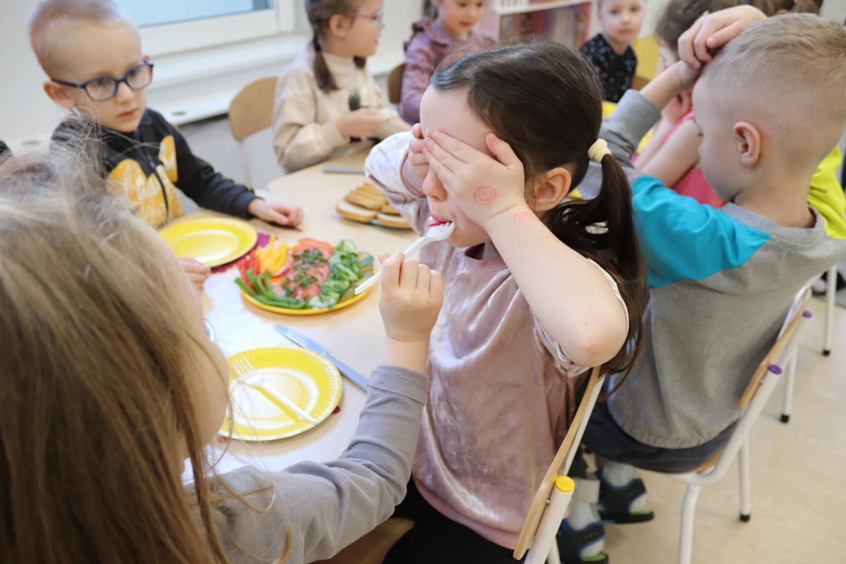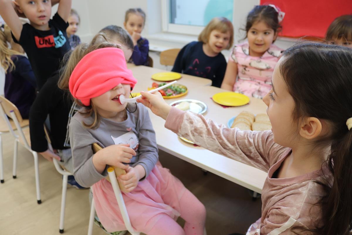 Na początku dzieci poznały zasady zdrowego odżywiania a następnie miały za zadanie odgadnąć jakim warzywem są częstowane przez swoich kolegów.