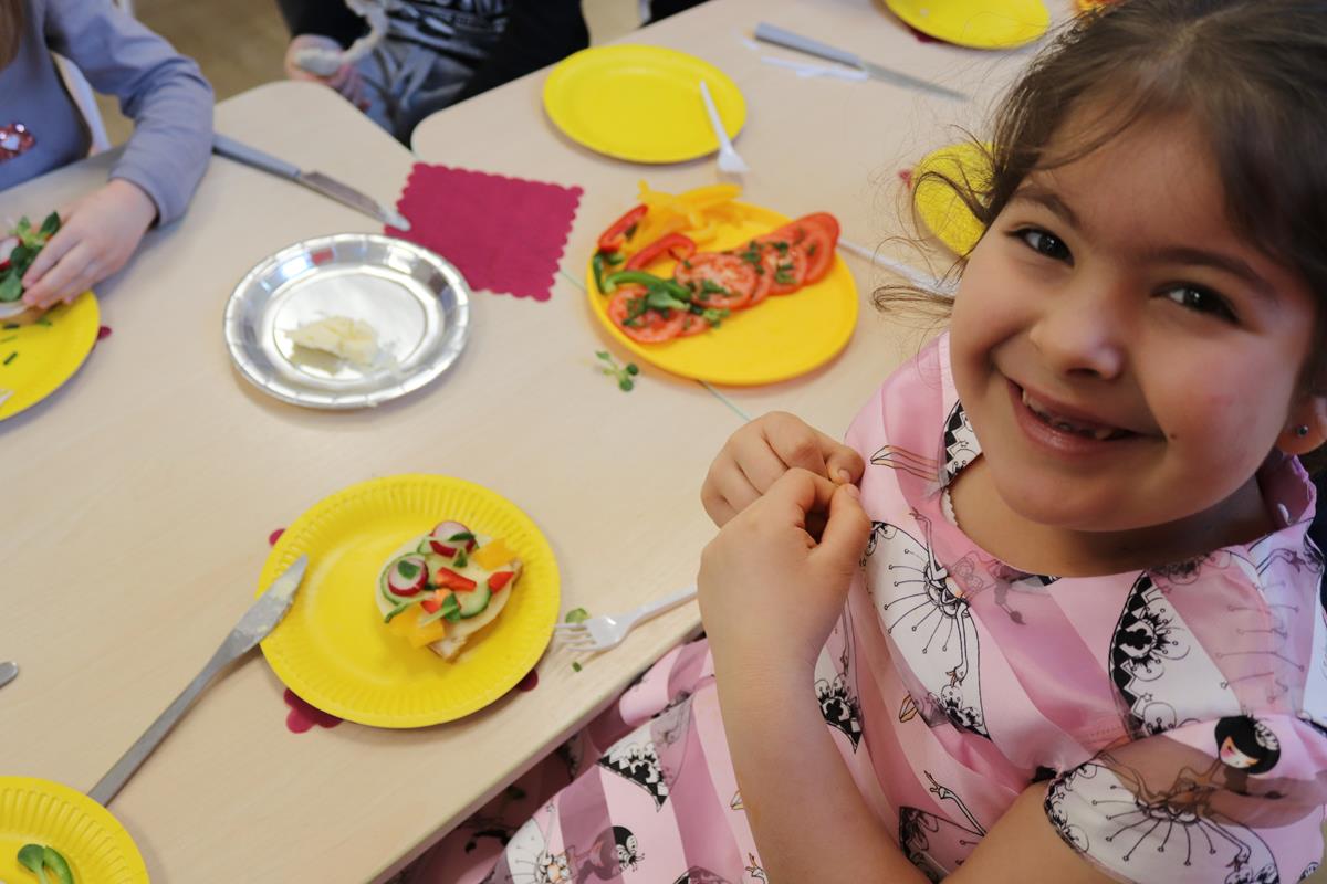 Warsztaty miały na celu kształtowanie u dzieci odpowiednich nawyków żywienieniowych, poznanie kolejności wykonywanych działań, rozwijanie kreatywności oraz zmysłu smaku,