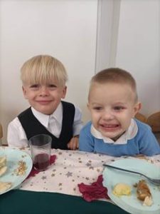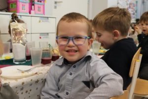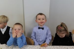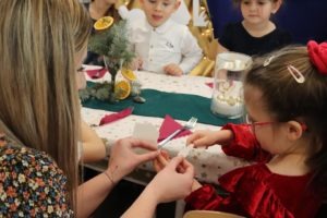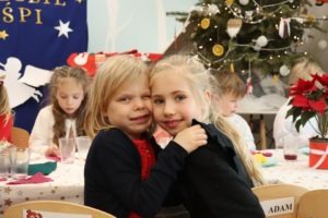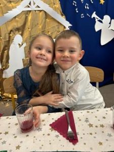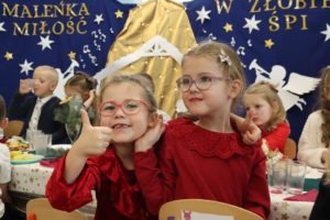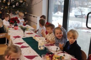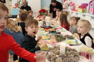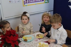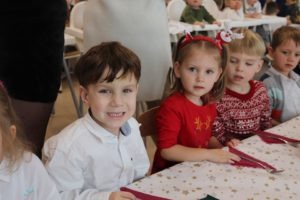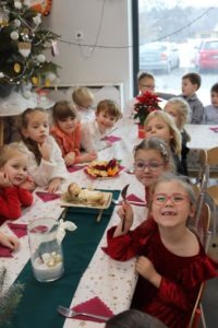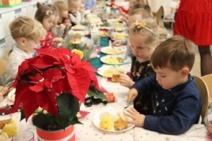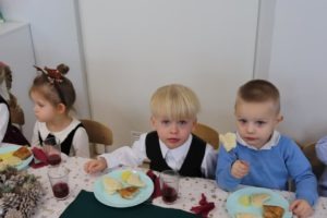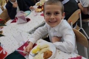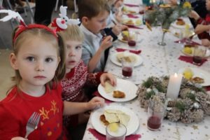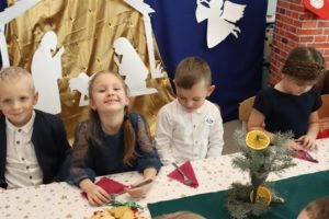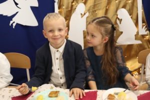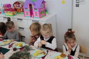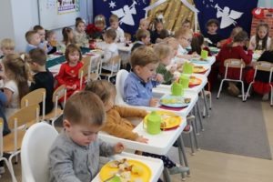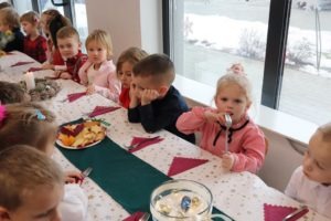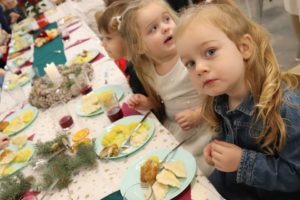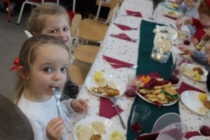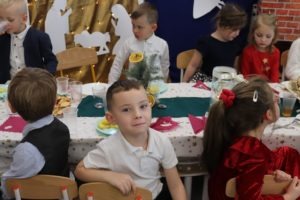 Przy pięknie udekorowanych stołach dzieci spożywały tradycyjny barszczyk, rybkę czy pierogi
