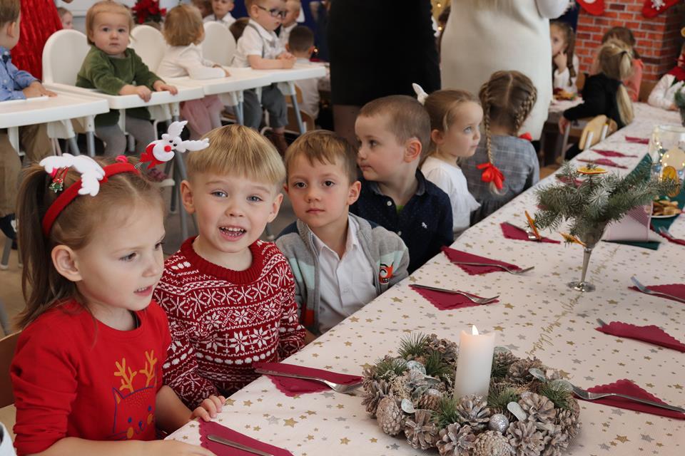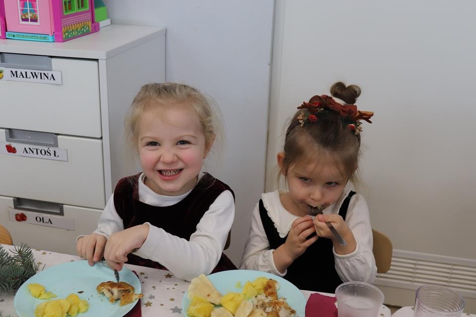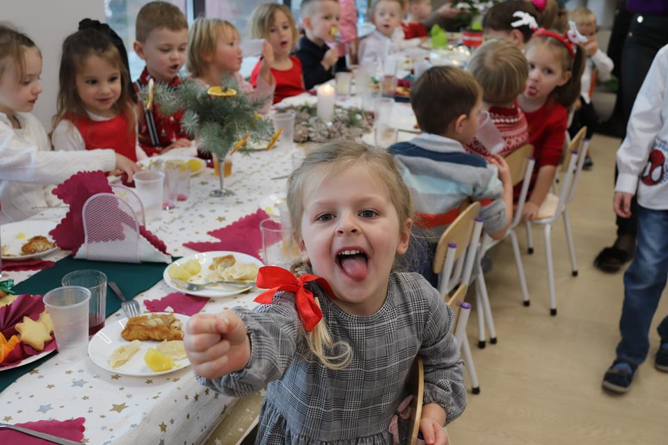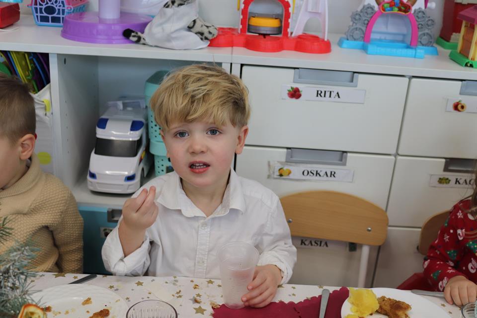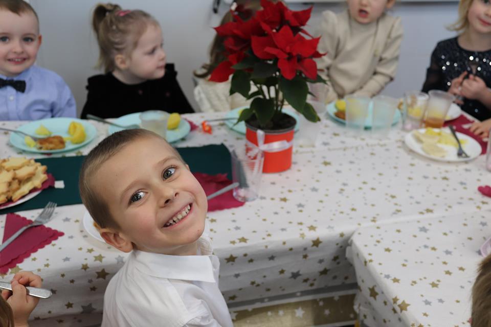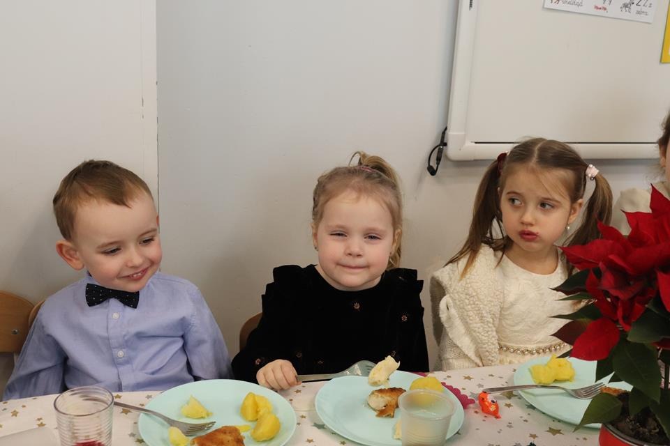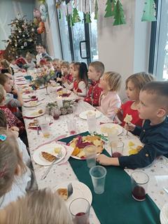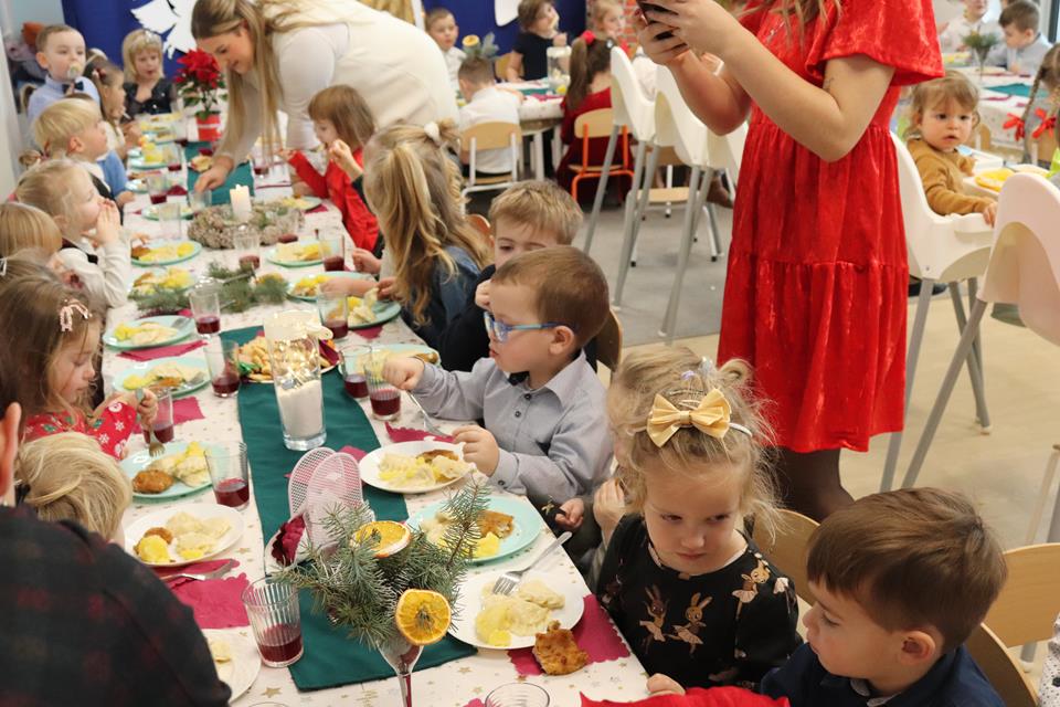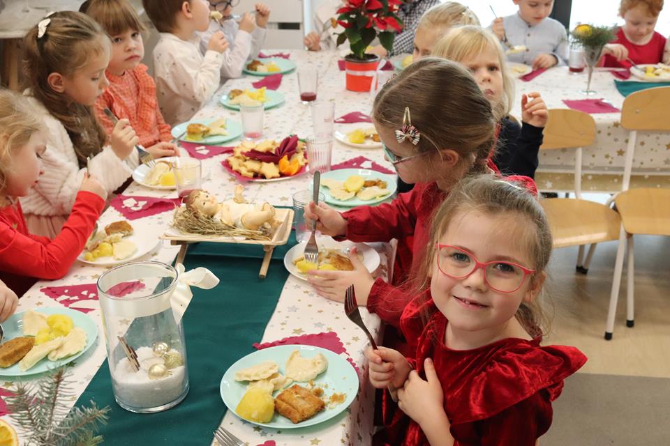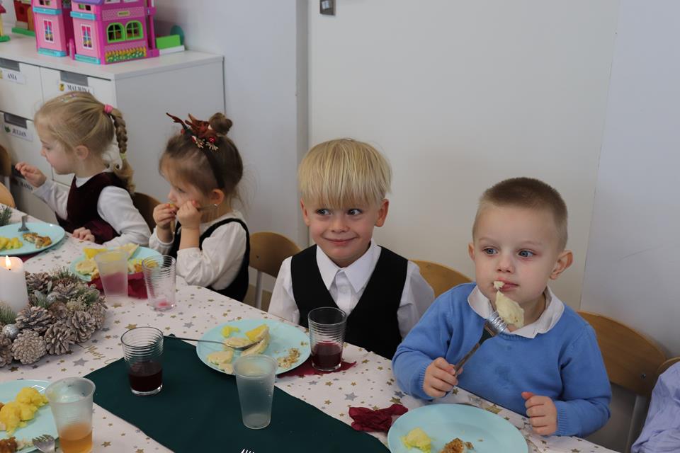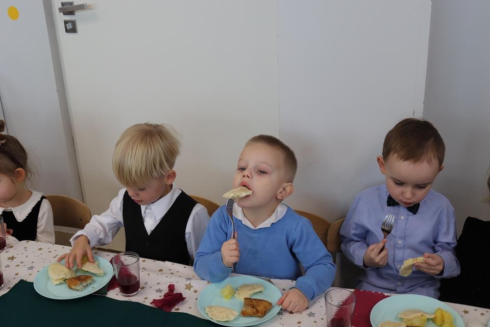 Przy pięknie udekorowanych stołach dzieci spożywały tradycyjny barszczyk, rybkę czy pierogi