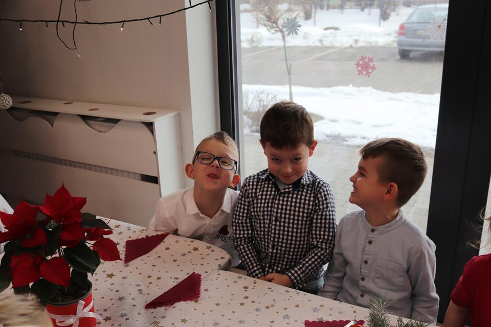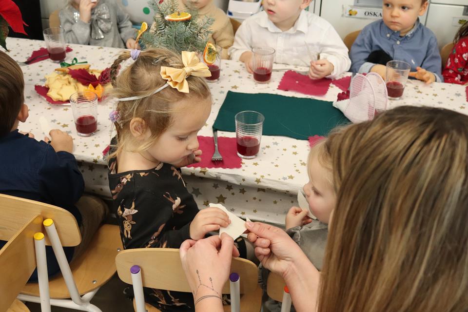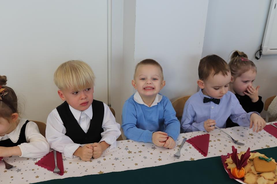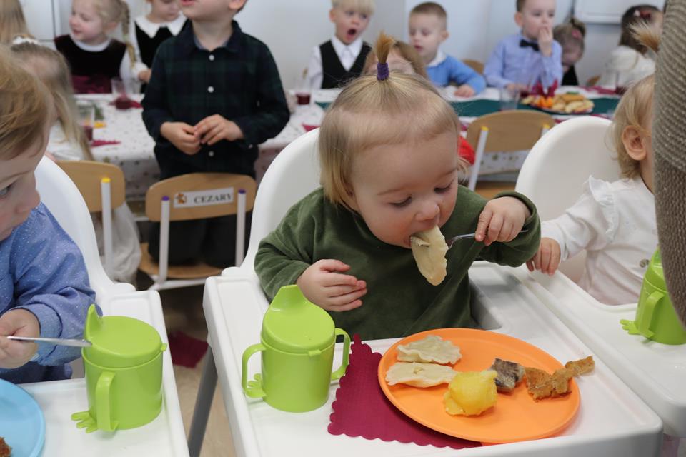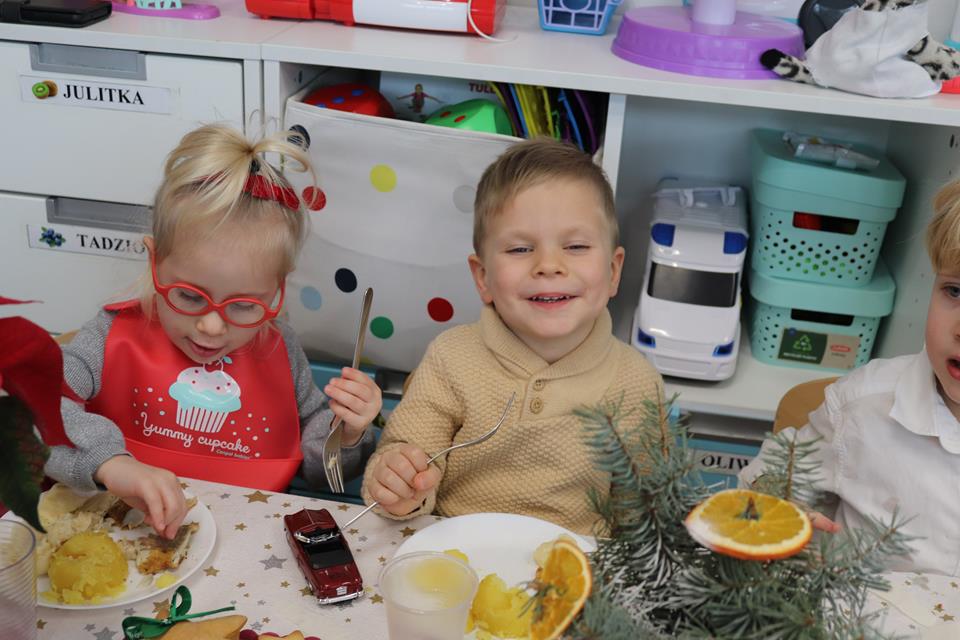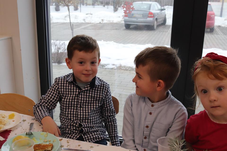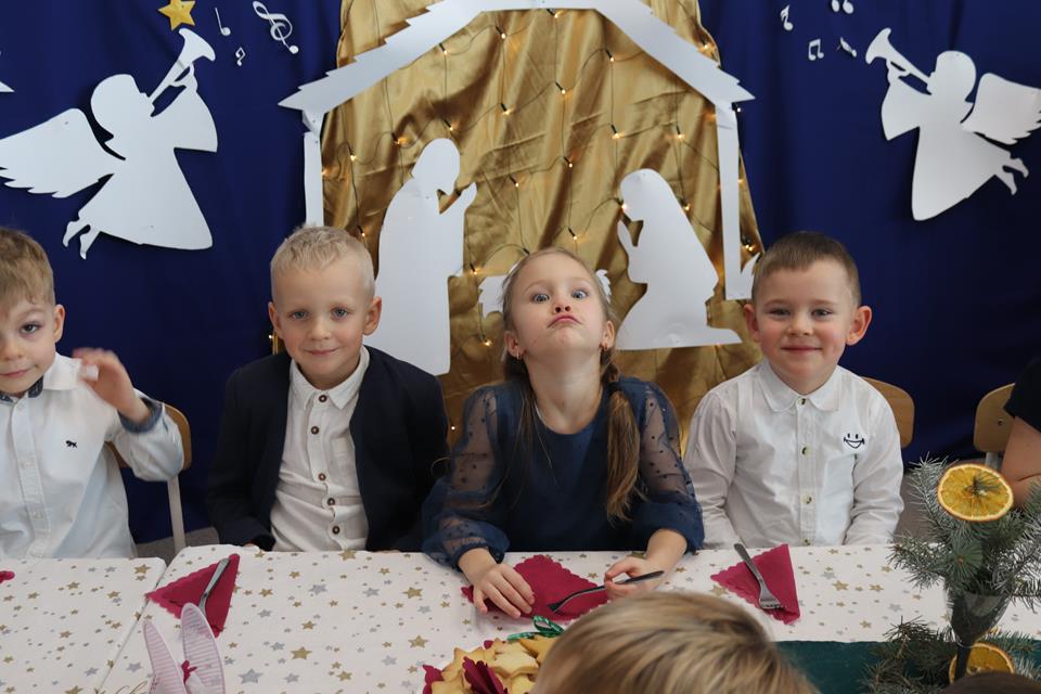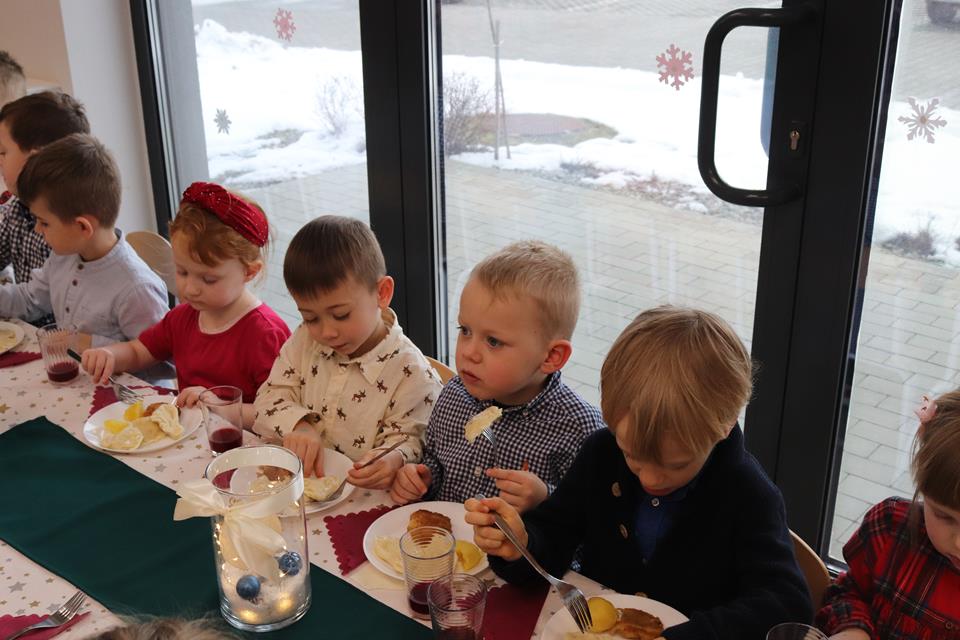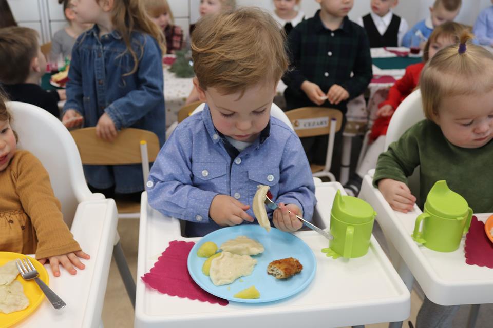 Przy pięknie udekorowanych stołach dzieci spożywały tradycyjny barszczyk, rybkę czy pierogi