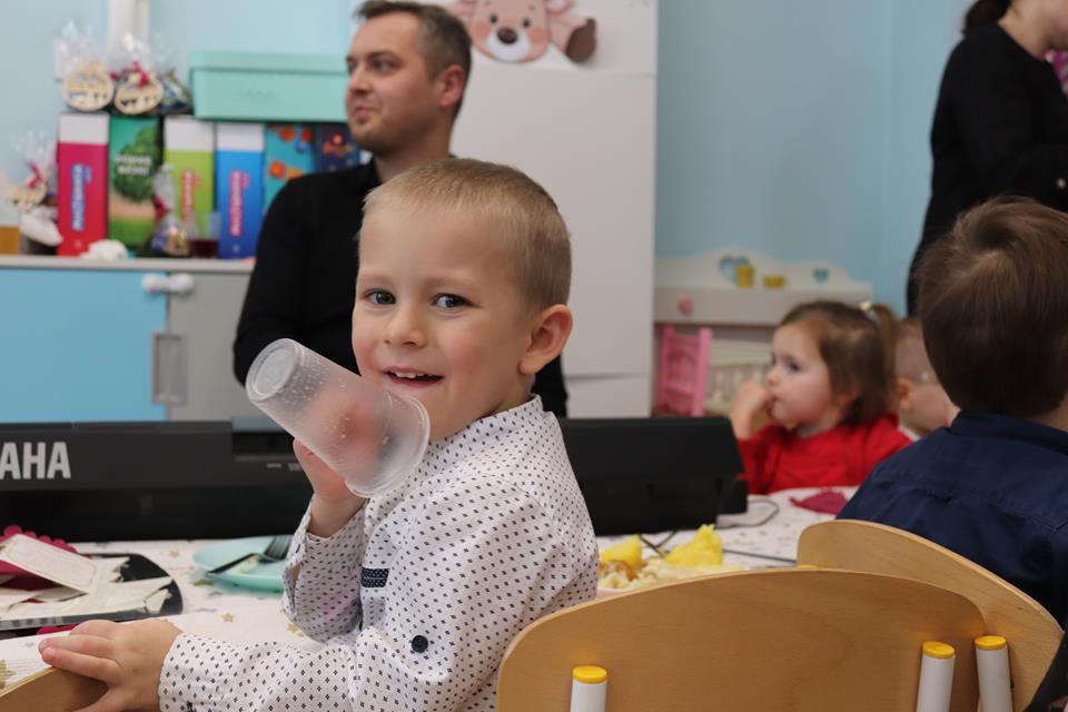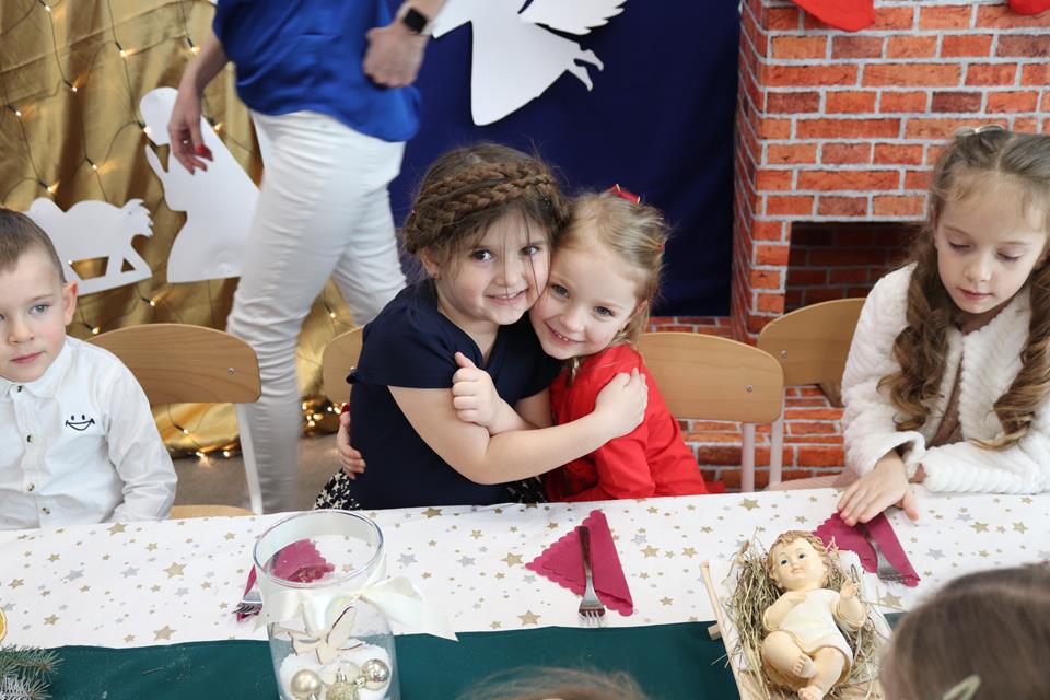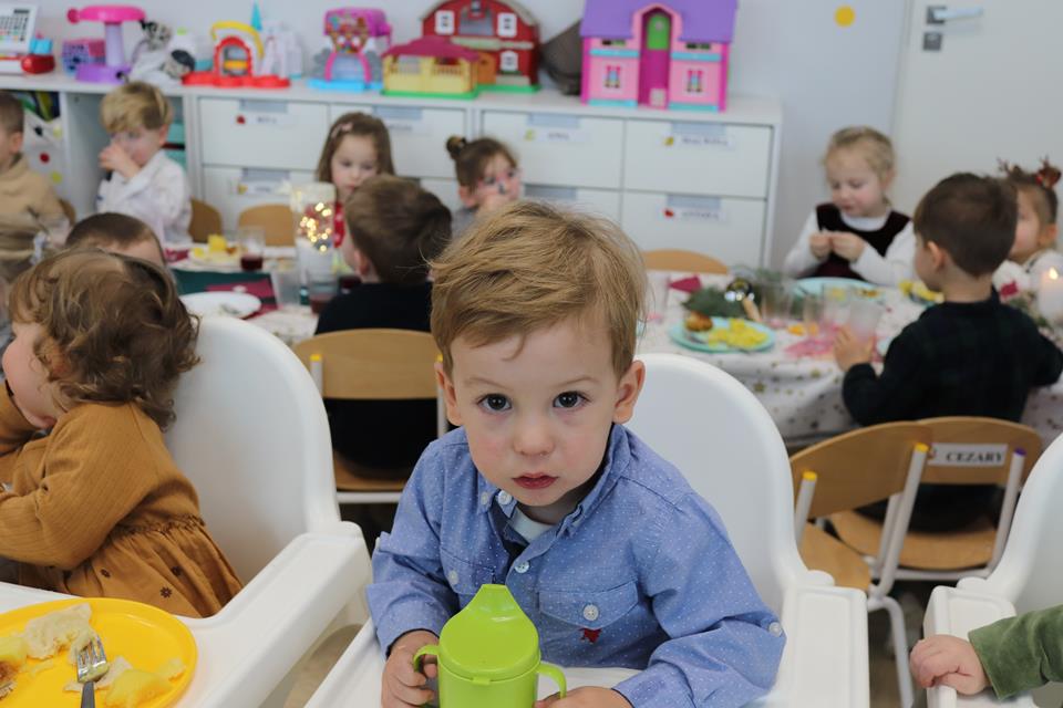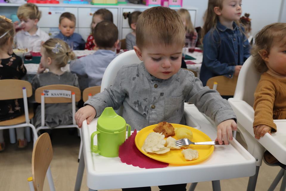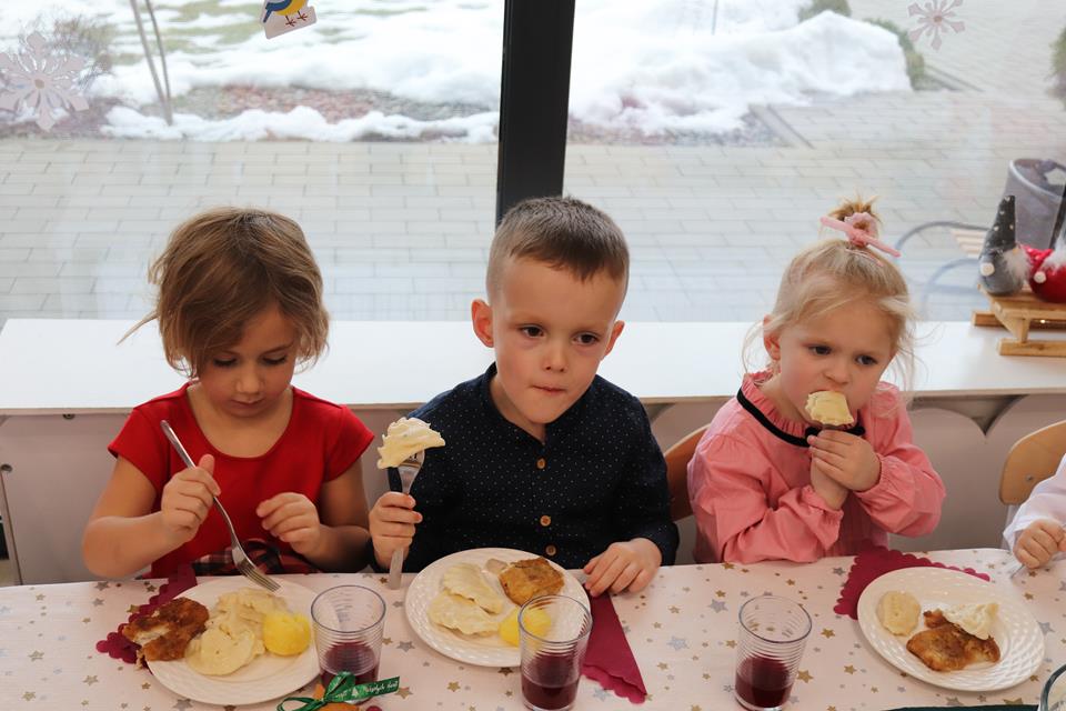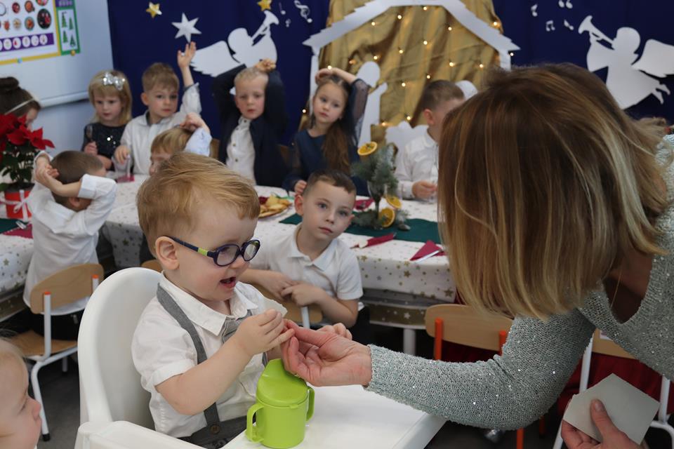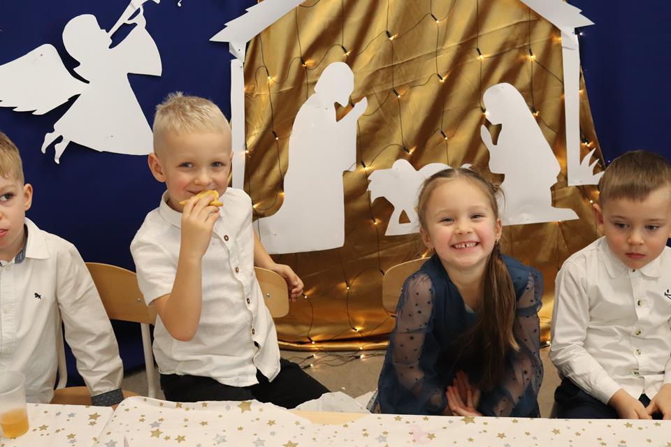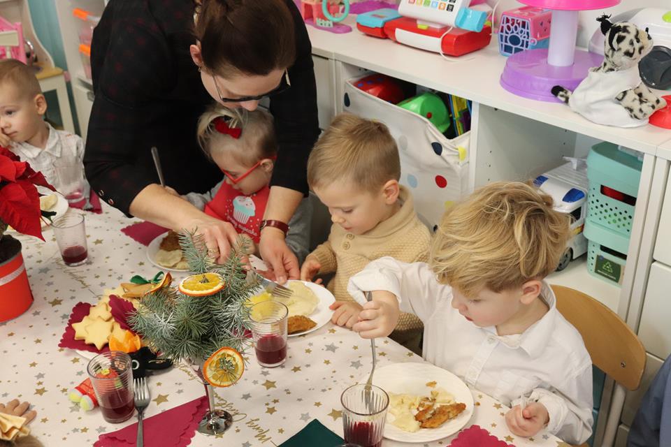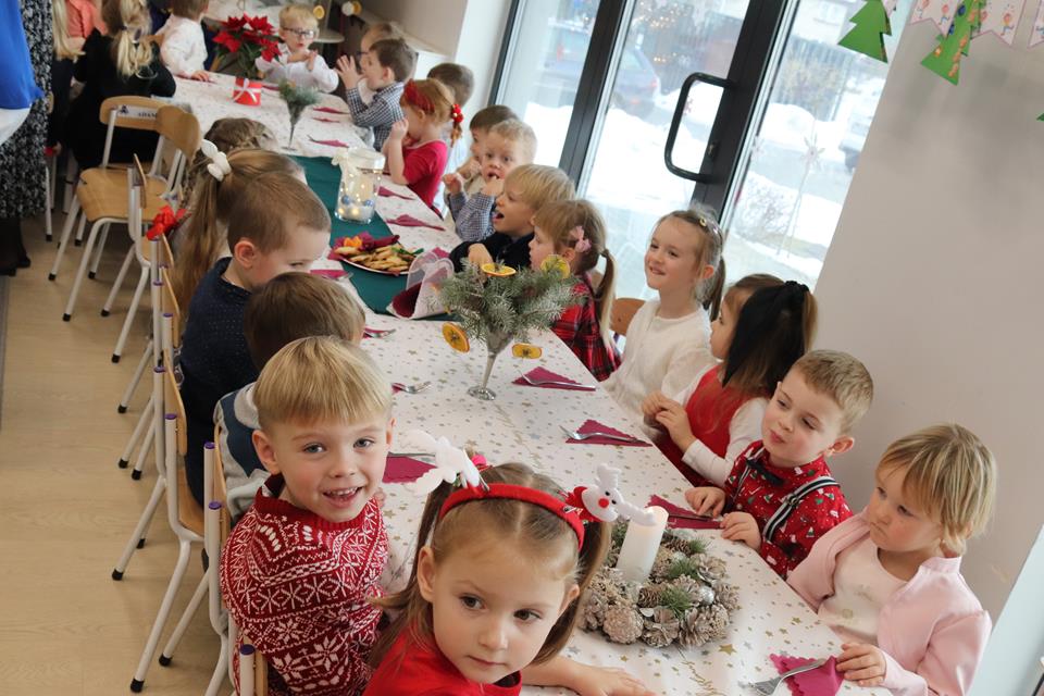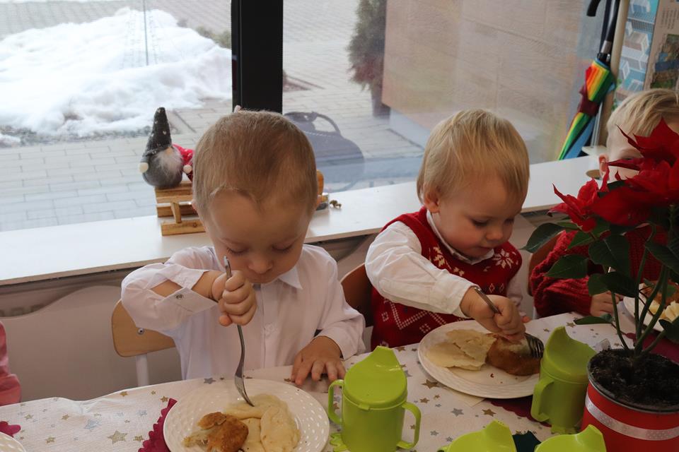 Przy pięknie udekorowanych stołach dzieci spożywały tradycyjny barszczyk, rybkę czy pierogi